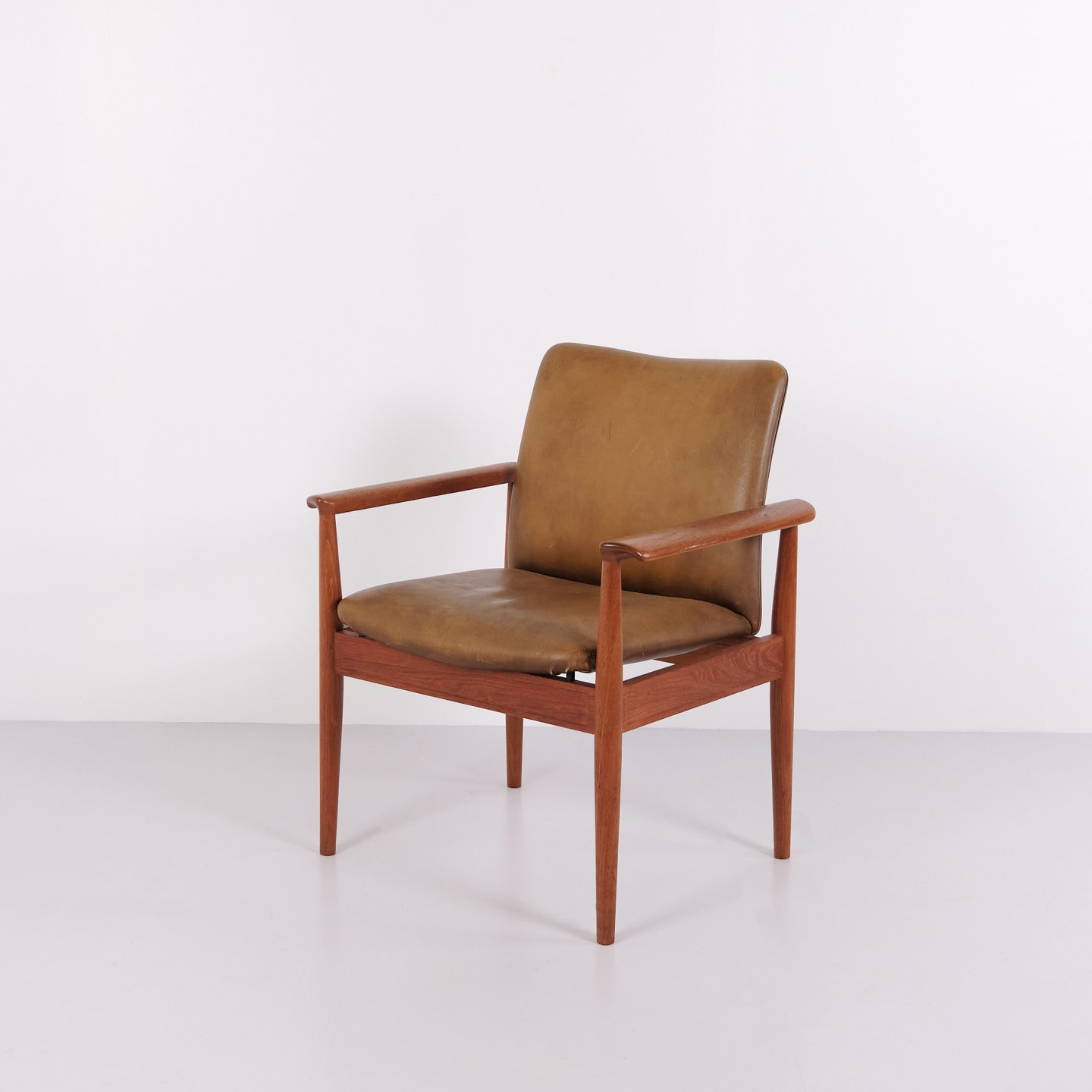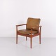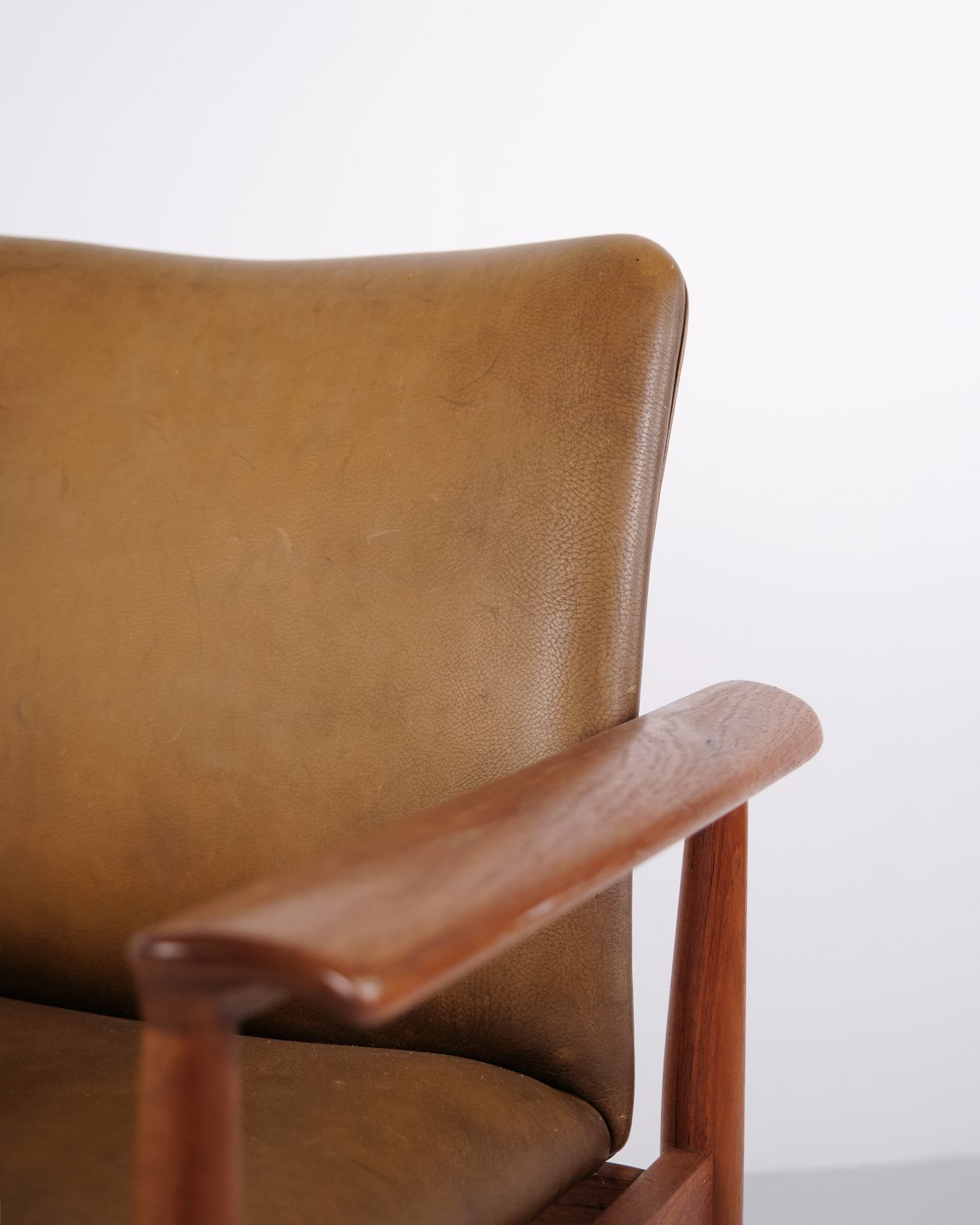 Fauteuil Finn Juhl Diplomat en teck et cuir patiné de France & Søn. Design danois des années 1960 avec un langage de forme iconique et sculptural.