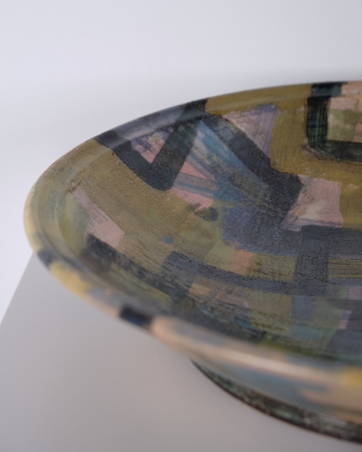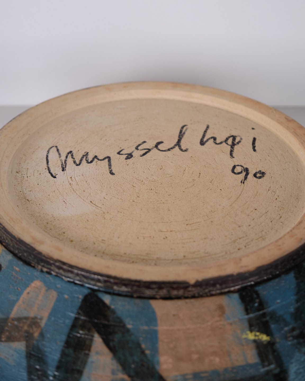 Plat en céramique unique réalisé et signé par le céramiste danois Per Weiss (né en 1953) en 1990. Le plat est décoré de couleurs vives avec un motif représentant Mysselhøj, un tumulus préhistorique situé à environ 1 km à l’ouest de Gammel Lejre près de Roskilde, où Per et Lene Weiss ont vécu auparavant. Le motif s’inspire du paysage historique de la région de Lejre et constitue une œuvre artistique unique.