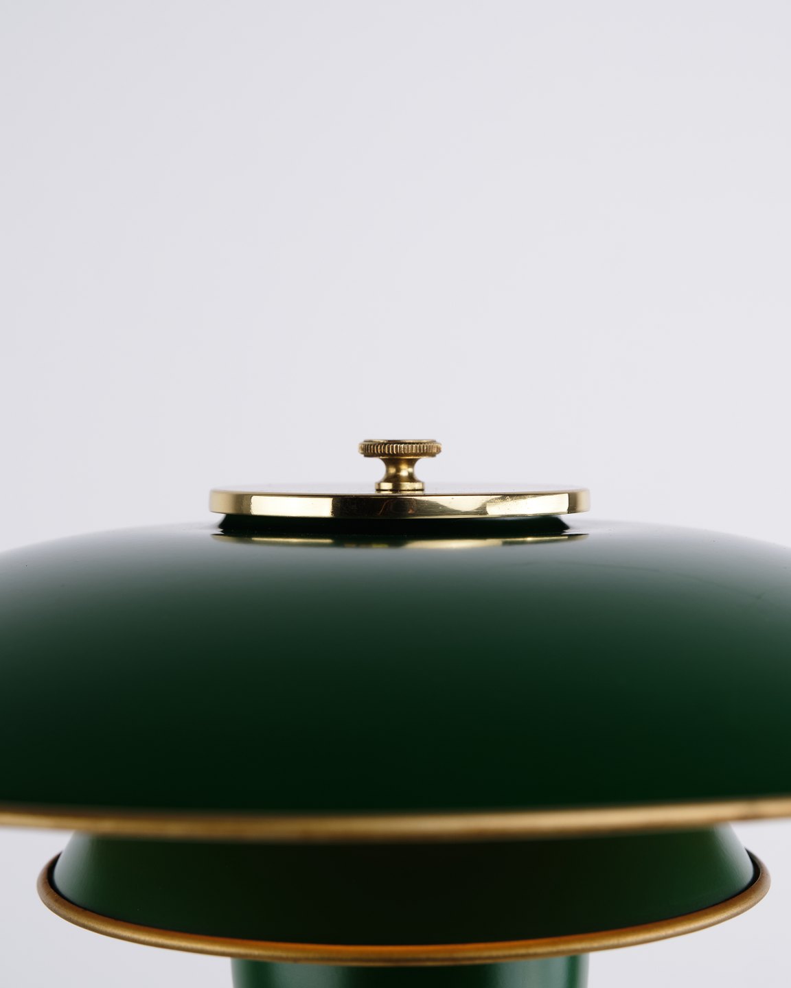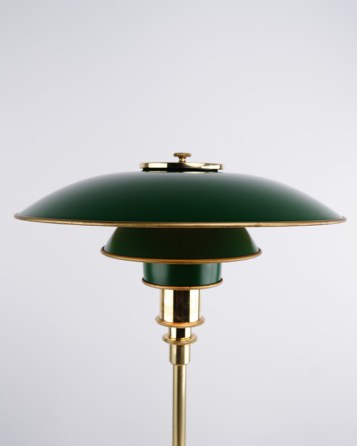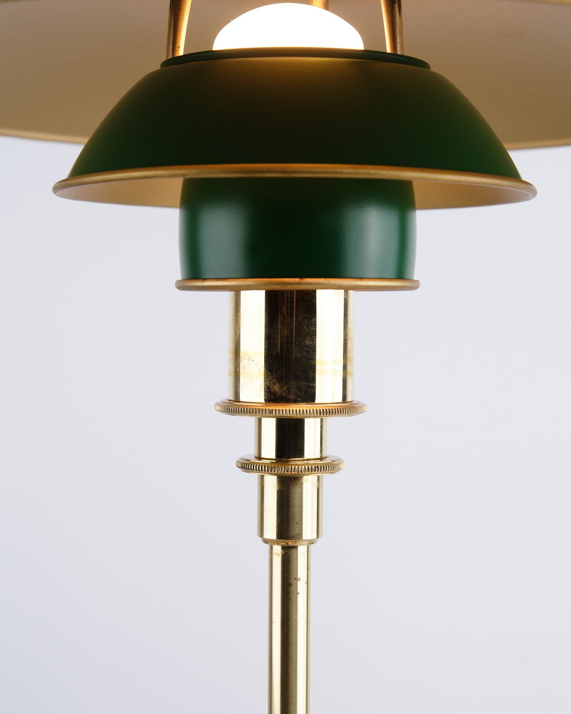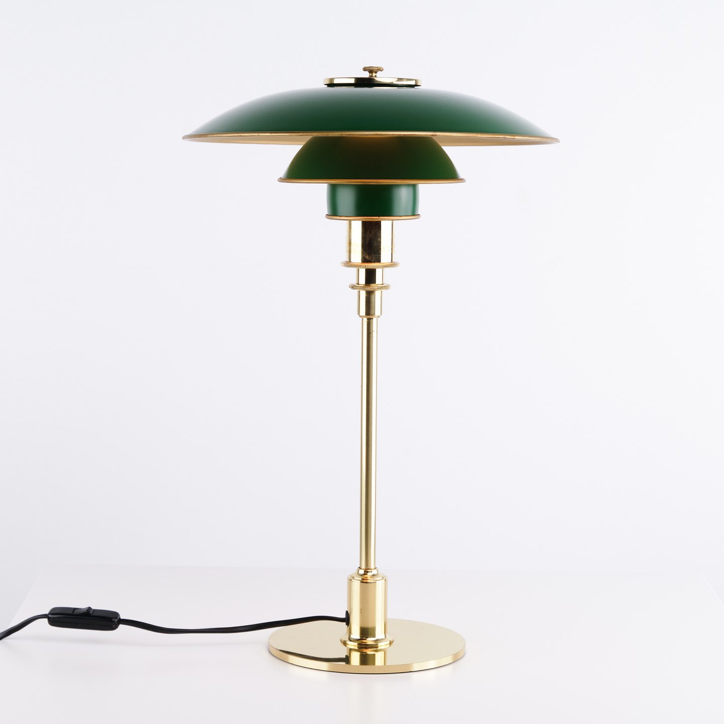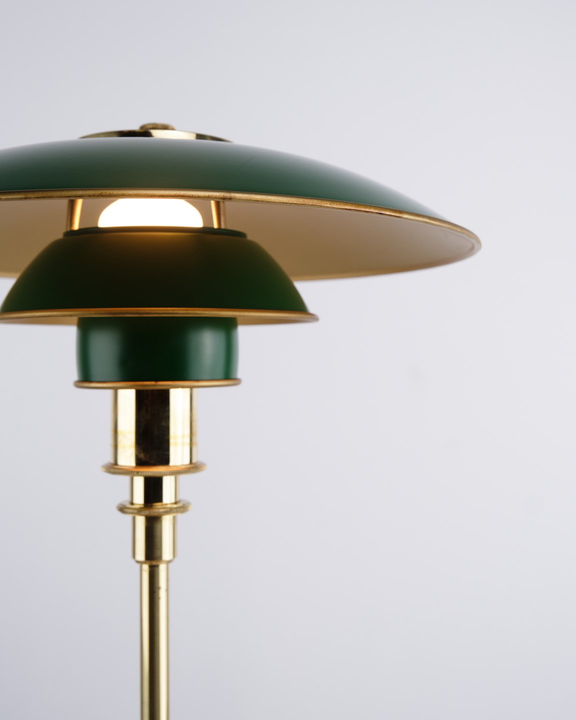 PH 3/2 table lamp designed by Poul Henningsen and released as an anniversary edition in 1996 by Louis Poulsen. The lamp is made in brass with green metal shades, giving a distinctive and classic expression. The model was only produced for a limited period and is also found in a variant with red metal shades.
