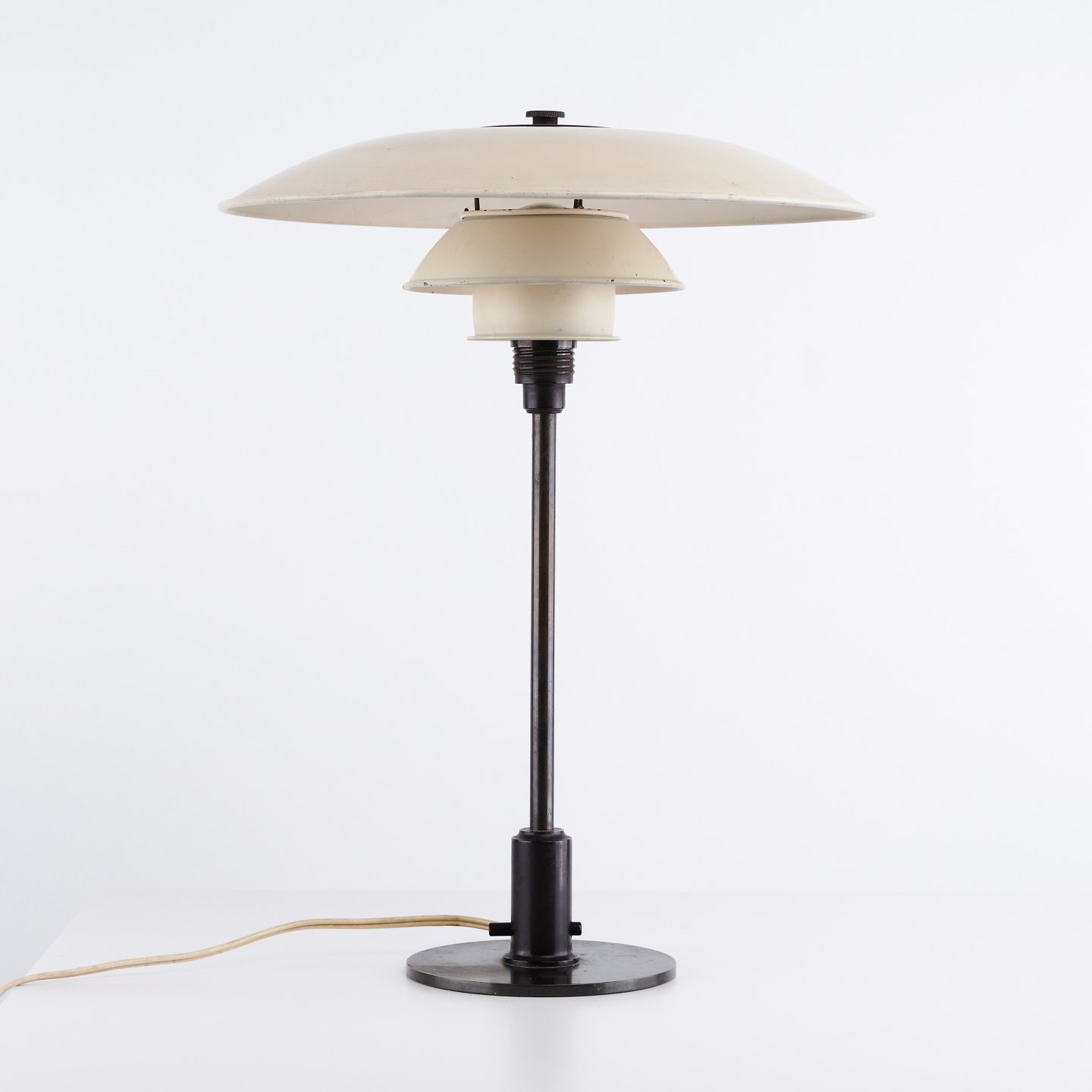 PH 3.5/2.5 table lamp designed by Poul Henningsen and produced by Louis Poulsen in the 1930s. The lamp is made with white painted metal shades, ensuring a soft and evenly distributed light.