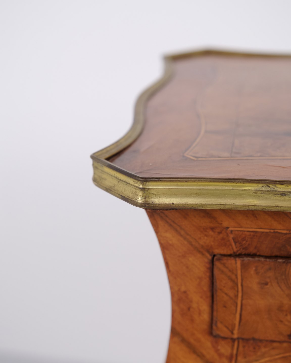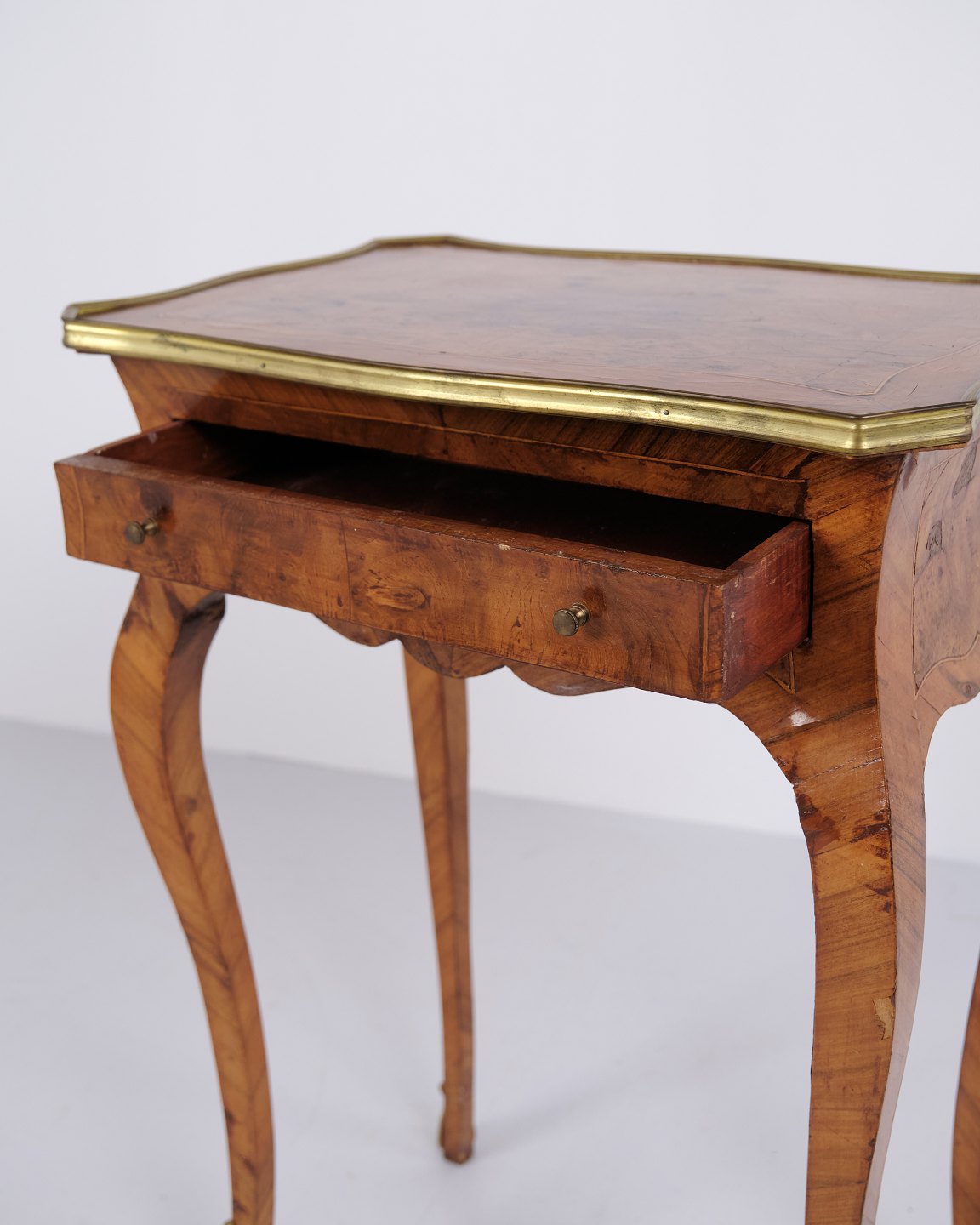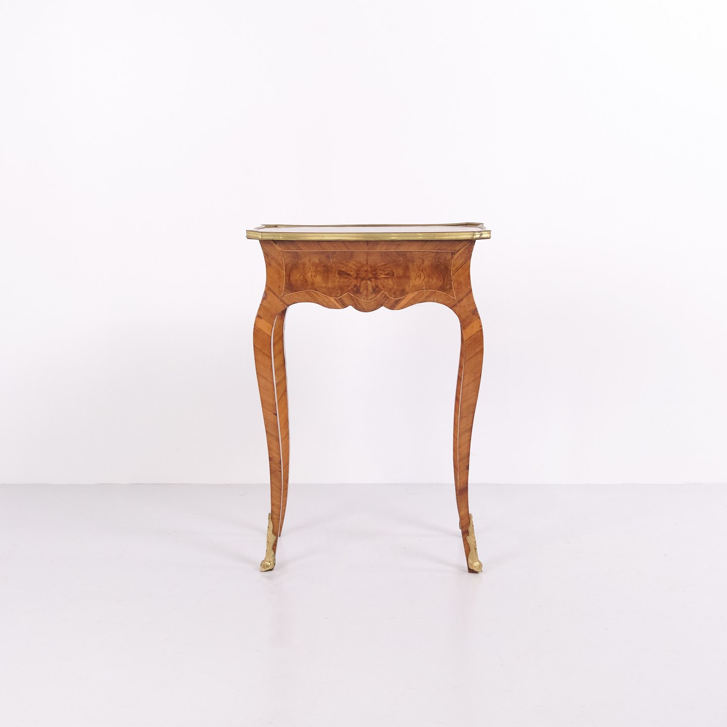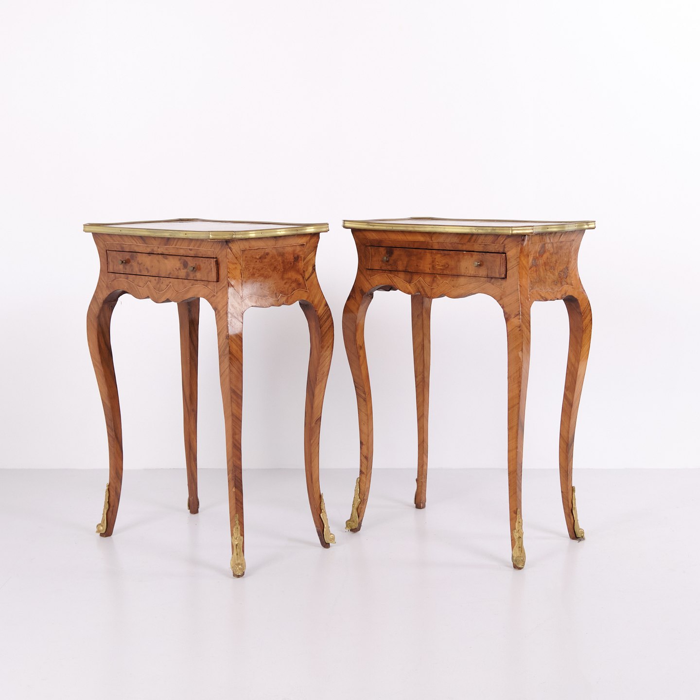 A pair of side tables in Neo-Rococo style from the 1890s. Crafted in rosewood with fine inlay decoration, curved legs, and details in bronze and brass edging. The richly decorated design and flowing lines reflect the historical style with a focus on craftsmanship and ornamentation.