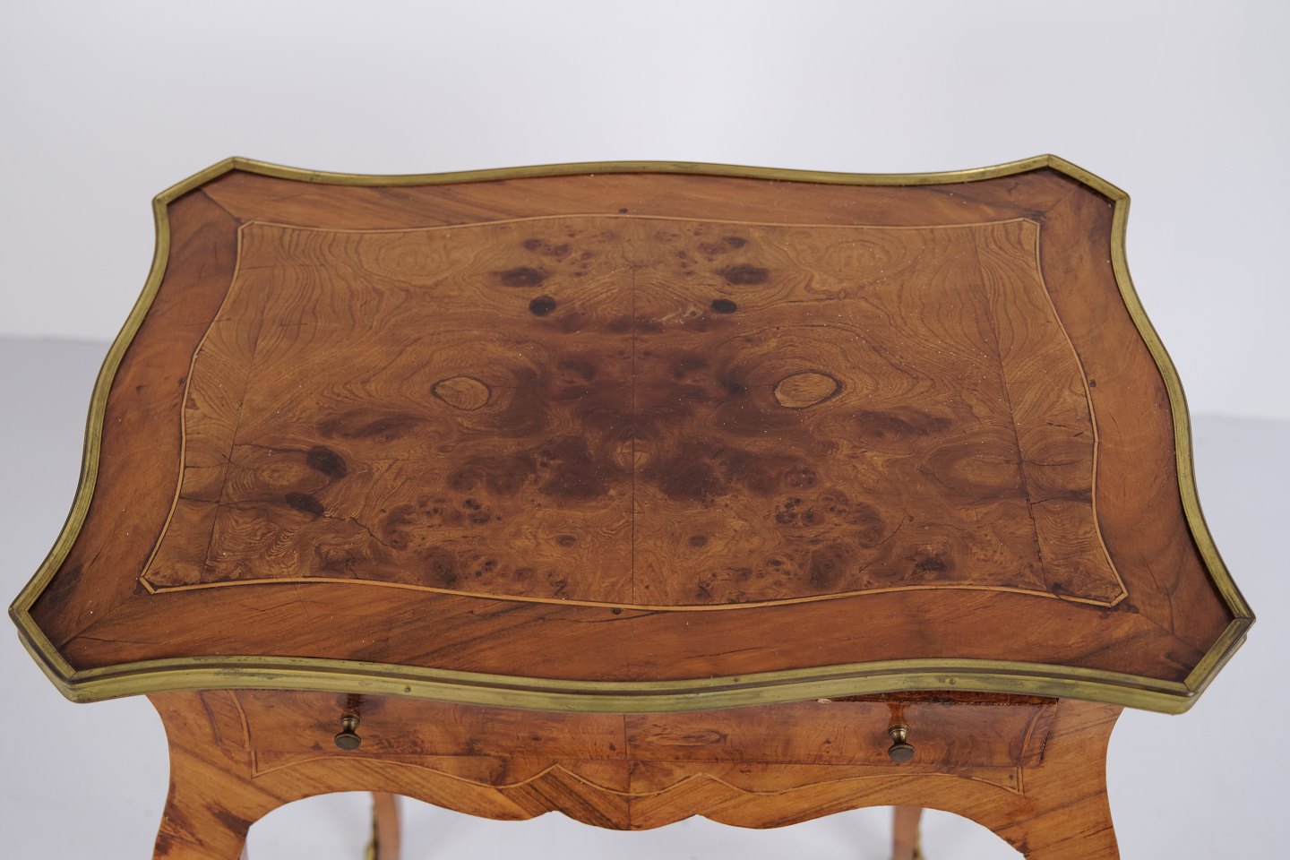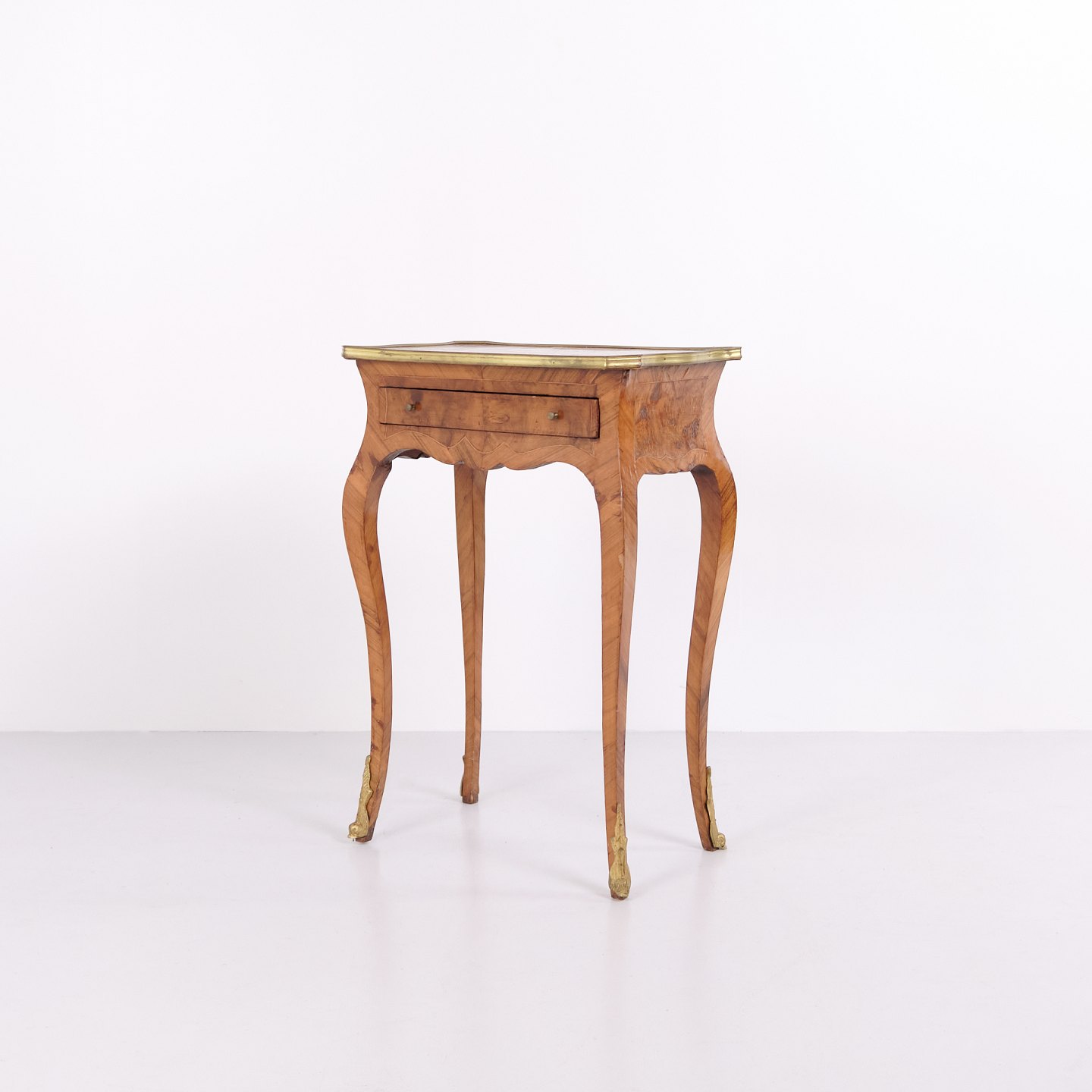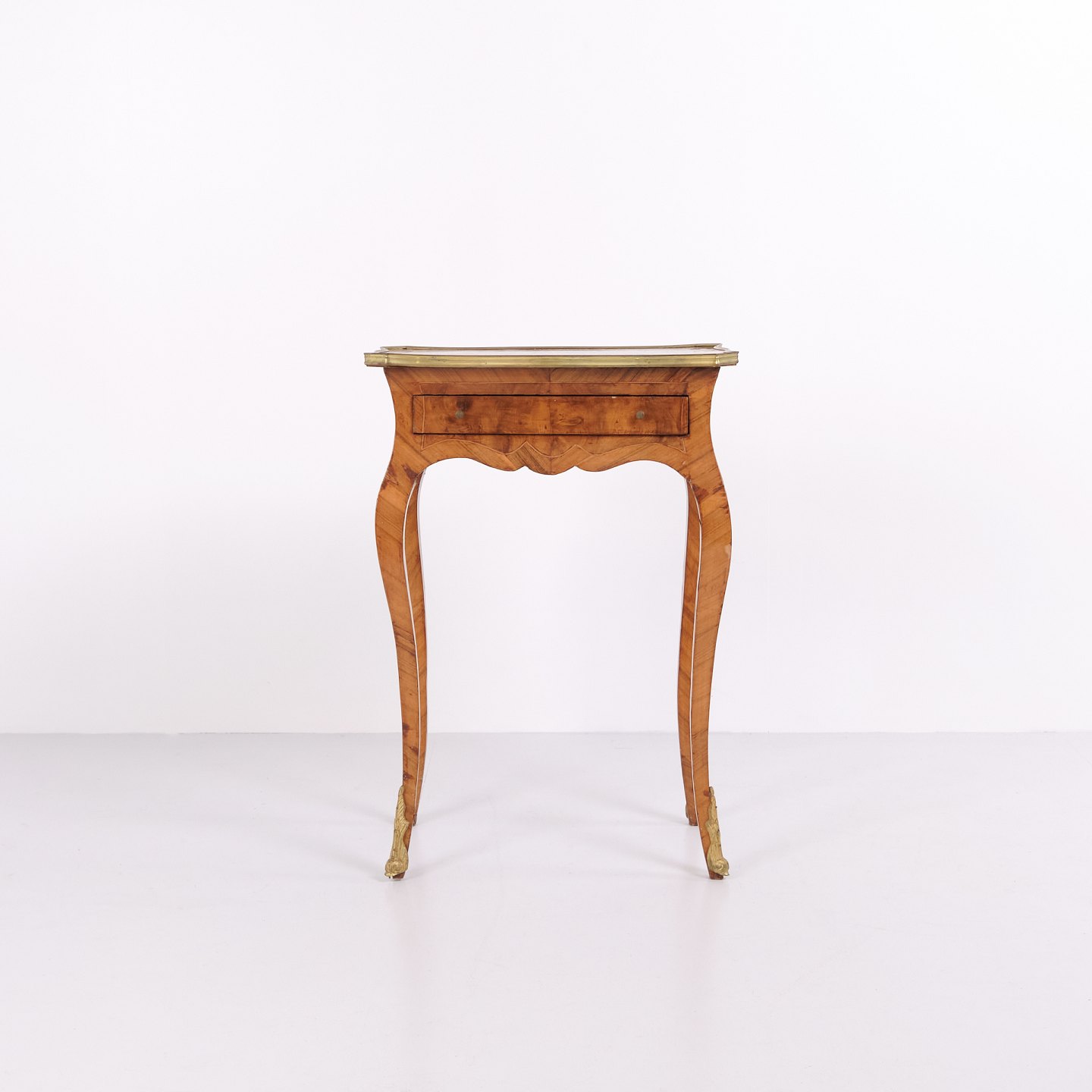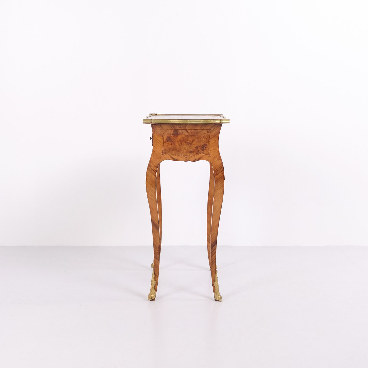 A pair of side tables in Neo-Rococo style from the 1890s. Crafted in rosewood with fine inlay decoration, curved legs, and details in bronze and brass edging. The richly decorated design and flowing lines reflect the historical style with a focus on craftsmanship and ornamentation.