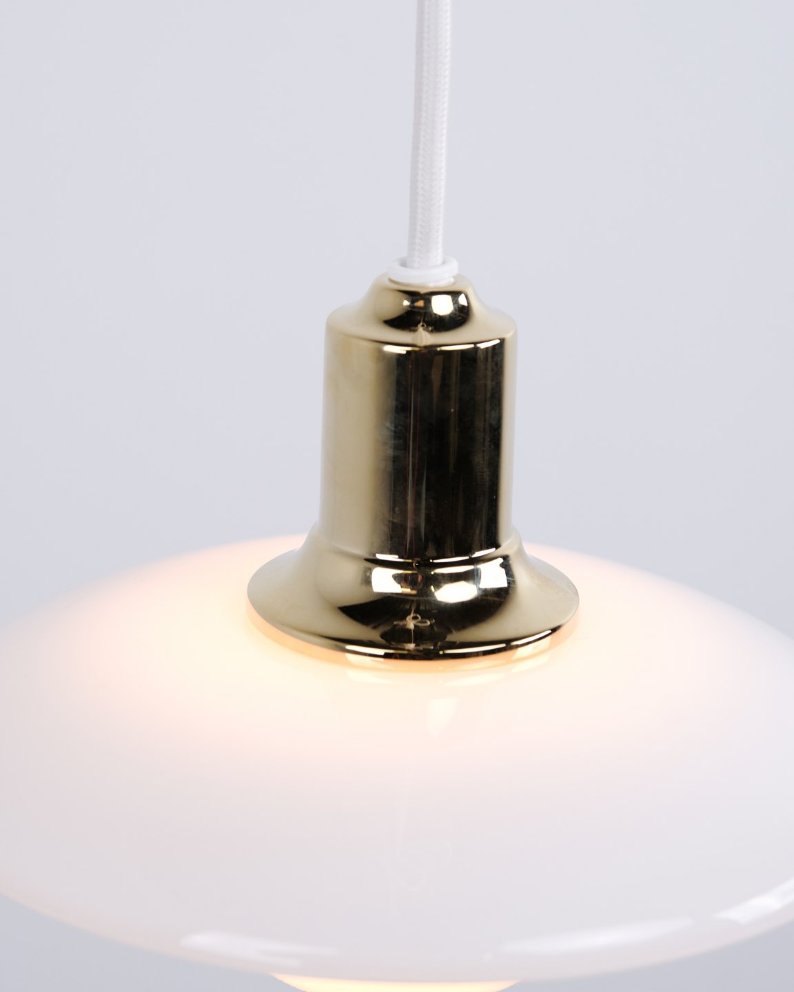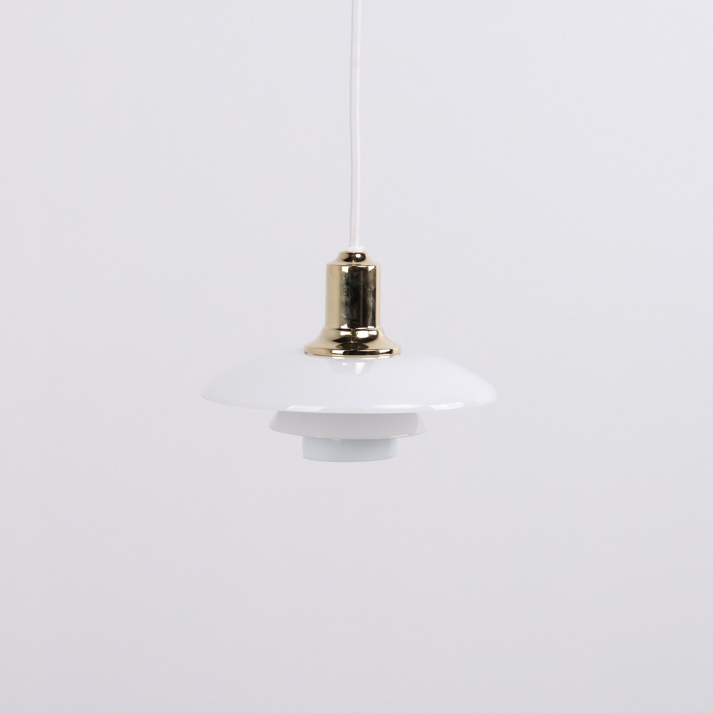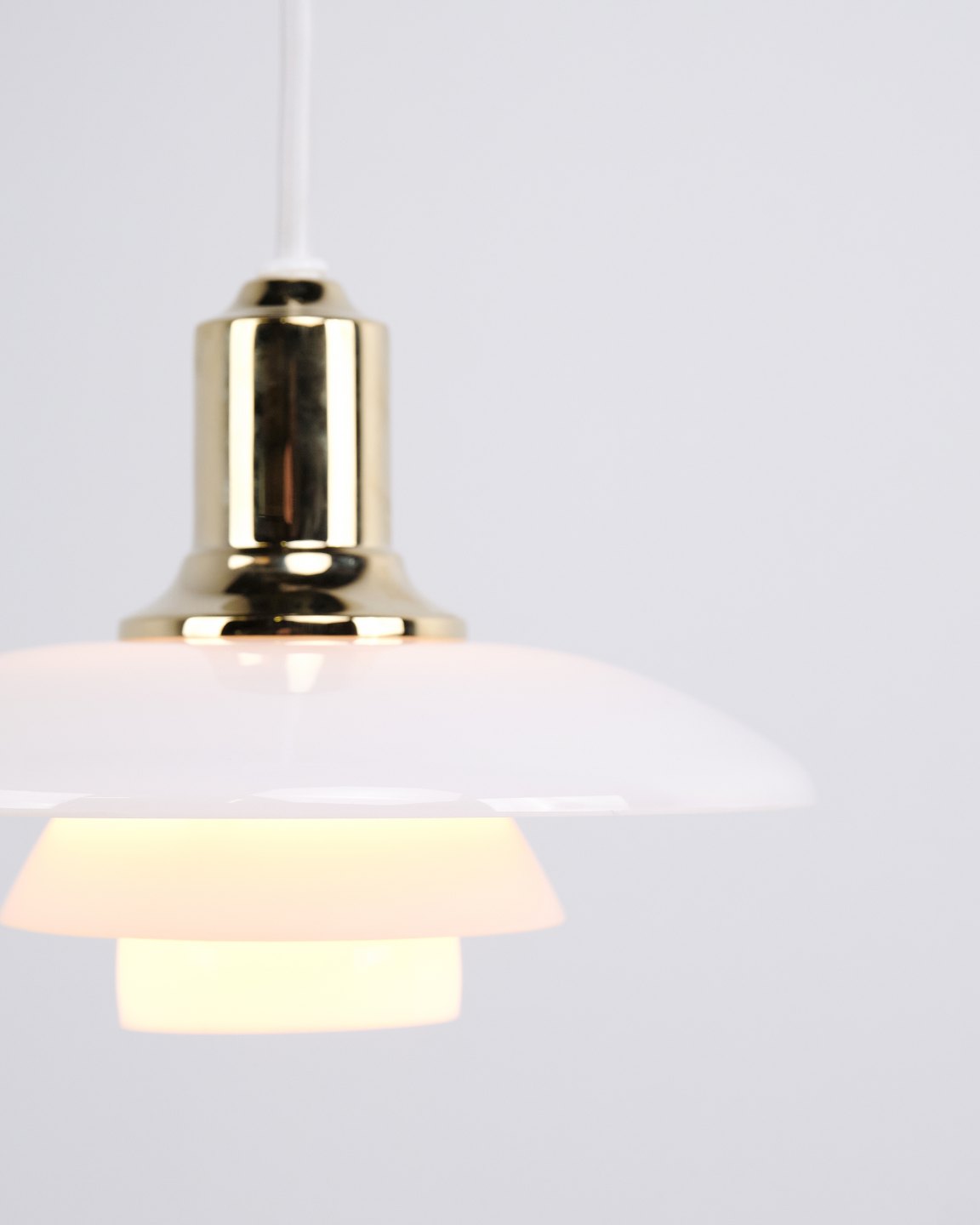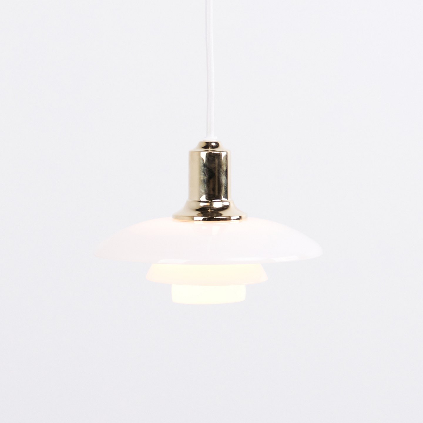 PH 2/1 pendant in brass with opal glass from Louis Poulsen. Designed by Poul Henningsen with classic Danish lighting design and glare-free illumination.