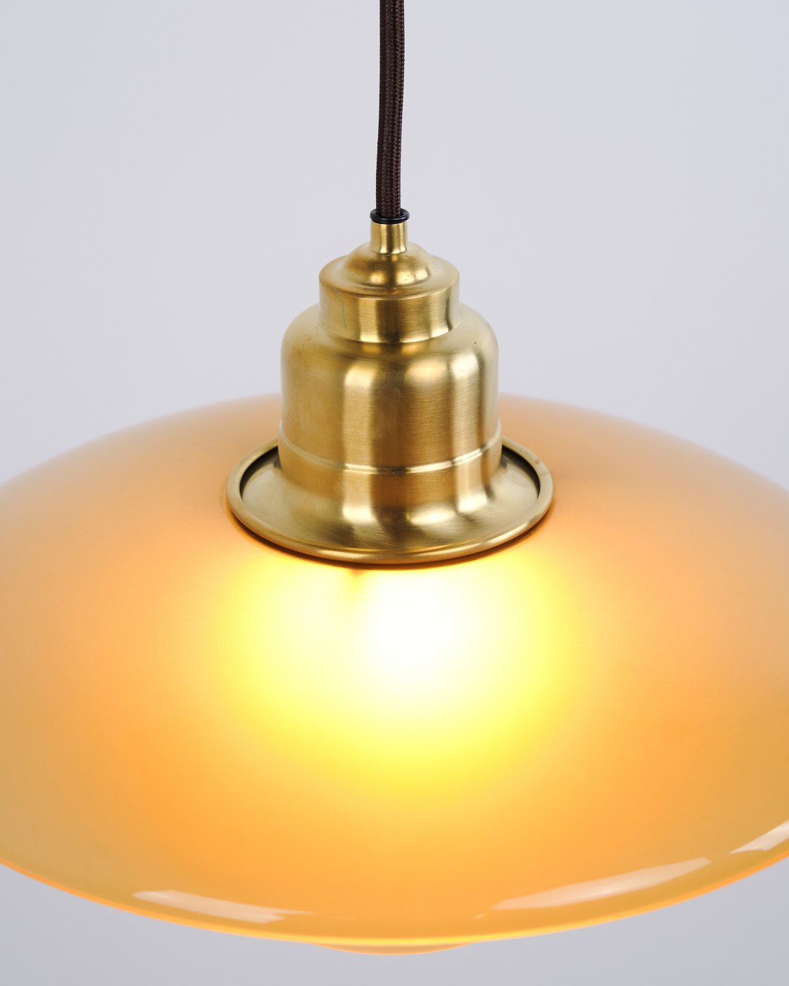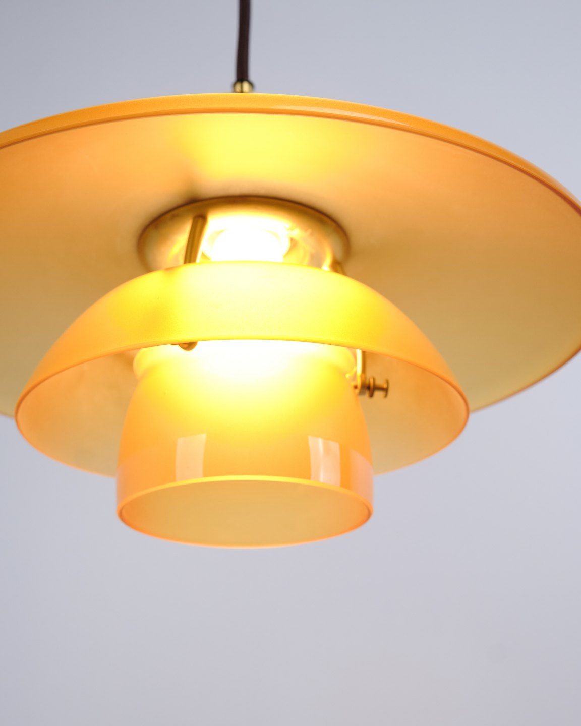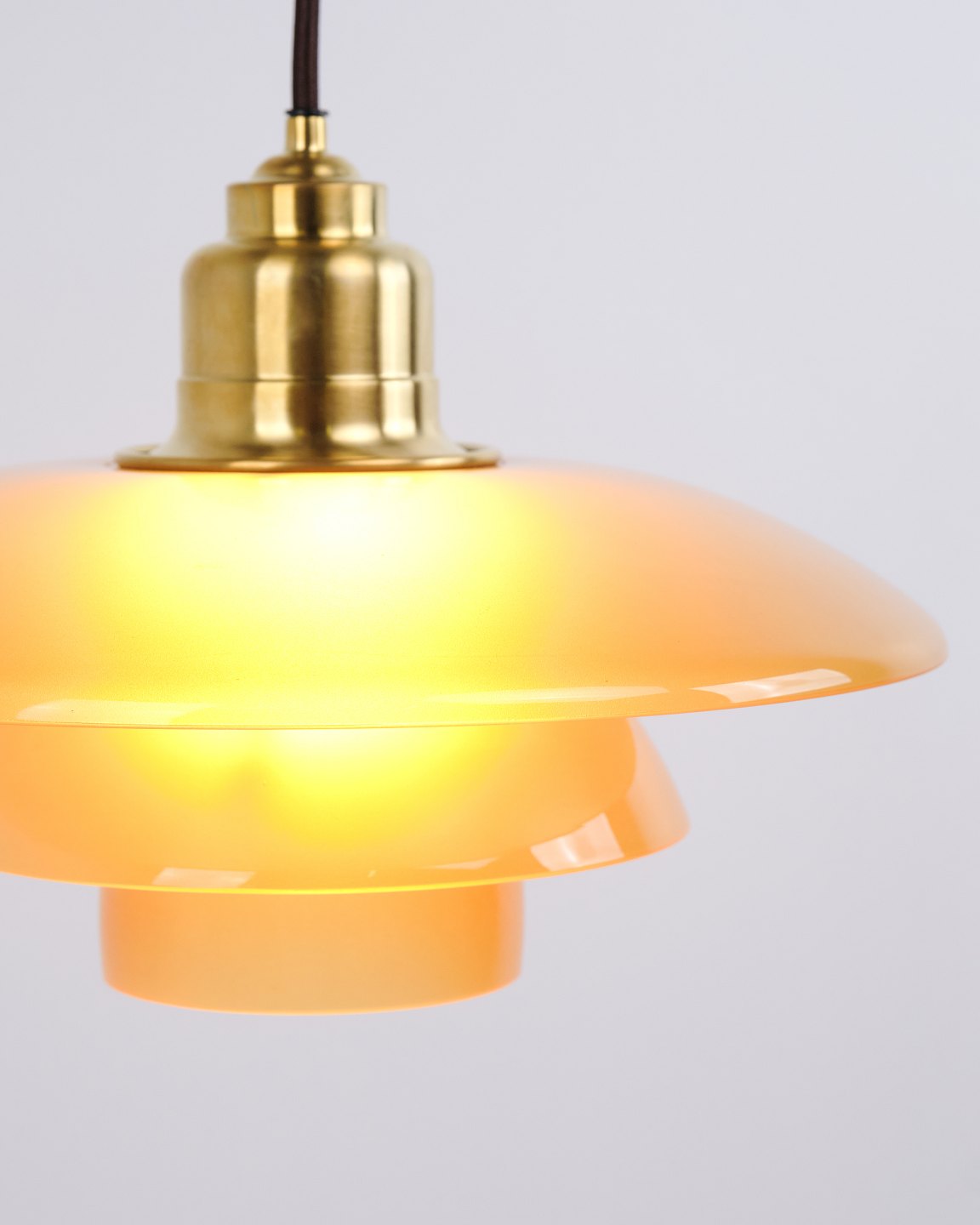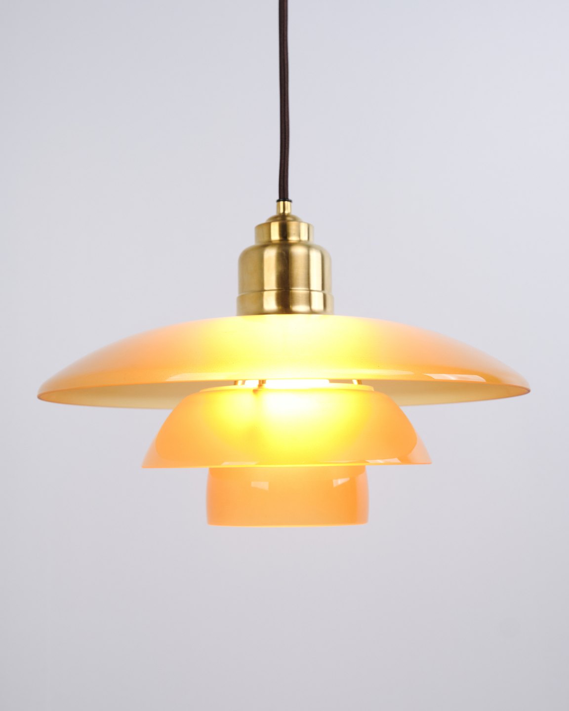 PH 3½-3 pendant designed by Poul Henningsen and released as a Limited Edition in 2017 by Louis Poulsen. The lamp features amber-coloured glass shades, creating a warm and atmospheric light. The model was only produced and sold for a short period, making it particularly sought after.