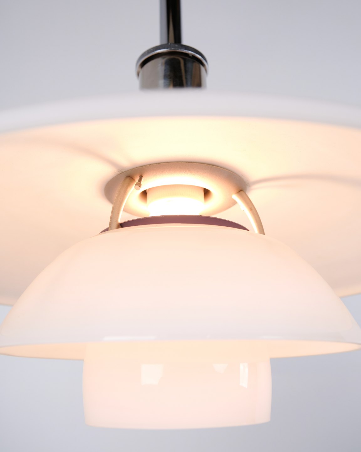 PH 4½-4 pendant designed by Poul Henningsen for Louis Poulsen. The lamp is made with hand-blown three-shade screens in white opal glass and chrome suspension. The model has a top shade of approximately 45 cm and uses the lower shades from the PH 4/4 series, developed to provide wider light distribution when hung low above a dining table or tabletop. The current version was introduced in 1980 and is part of the iconic PH glare-free lighting system.