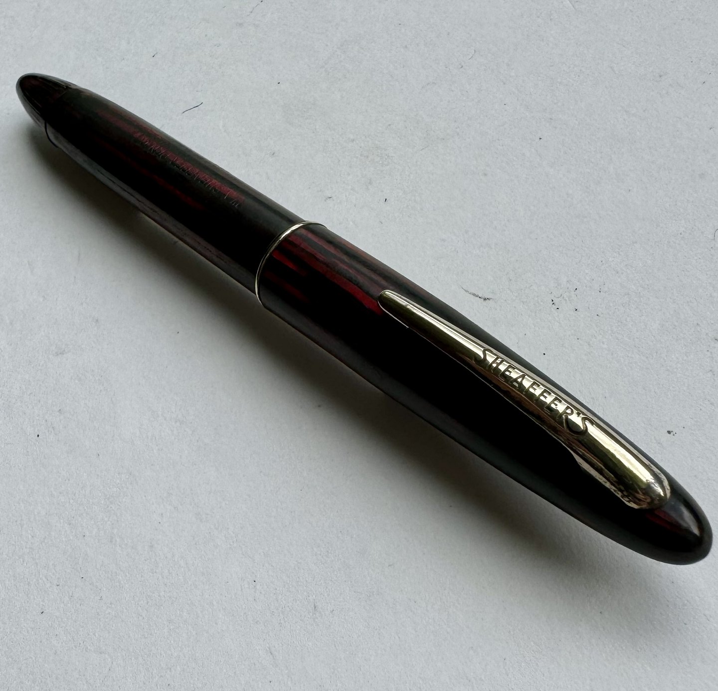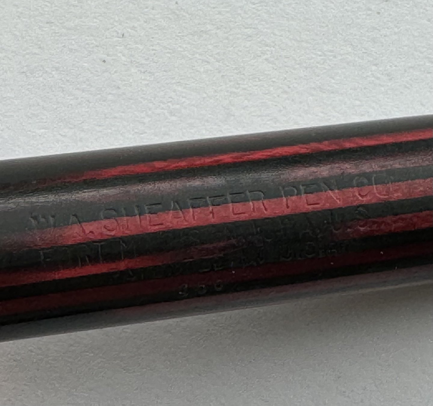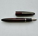 Rød og sort stribet Sheaffer fyldepen fra Sheaffer Pen Co. I U.S.A. Fremstår i god stand med skal repareres før end den igen holder blæk. Ingen skader eller reparationer. Alle dele originale til denne model. Mål: 12,5 cm lang.