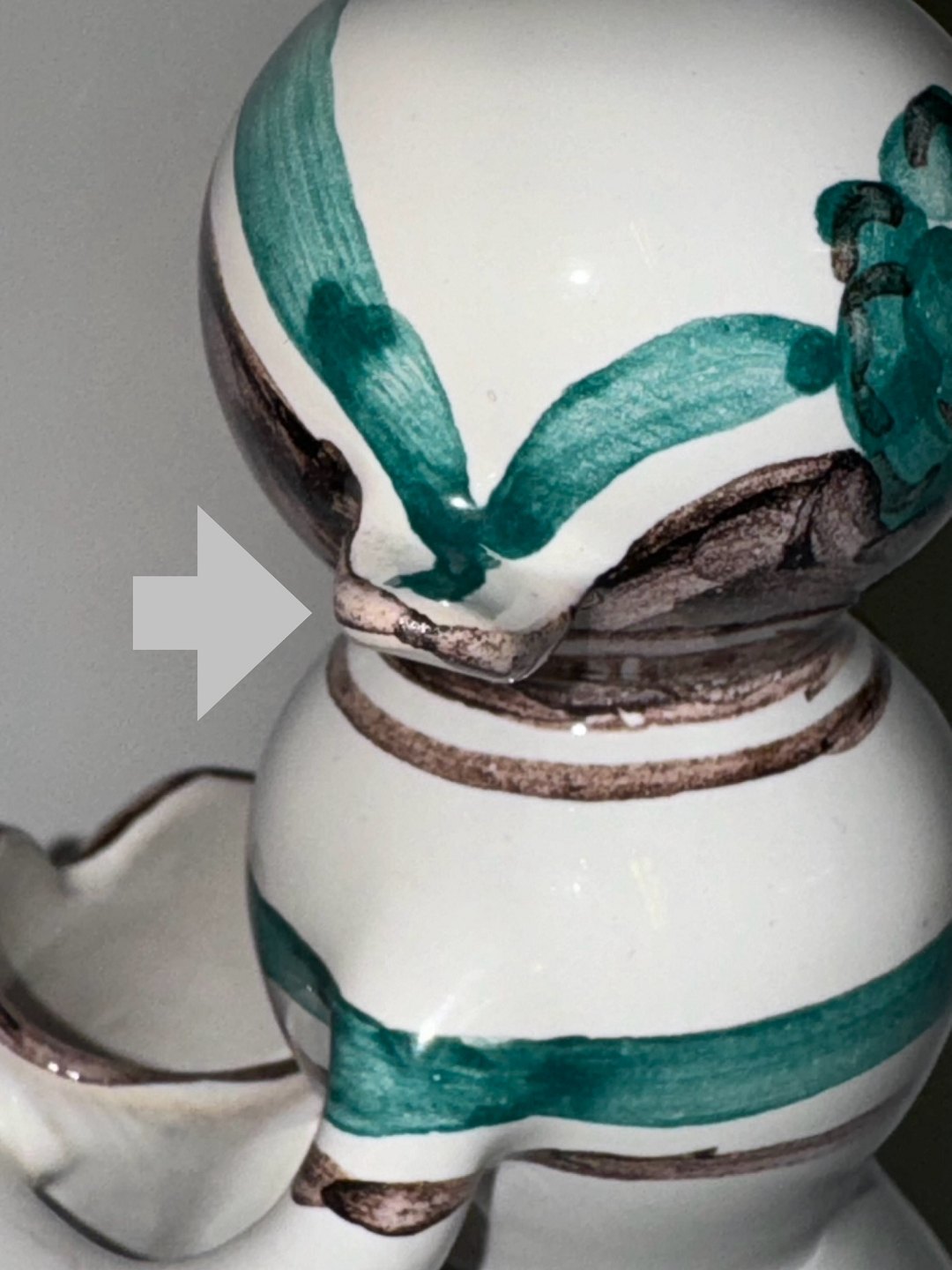 Fremstår i fin stand. Lille overflade skrab på huen. Se foto med grå pil. Fabriksmærket på bunden. 18,5 cm høj.