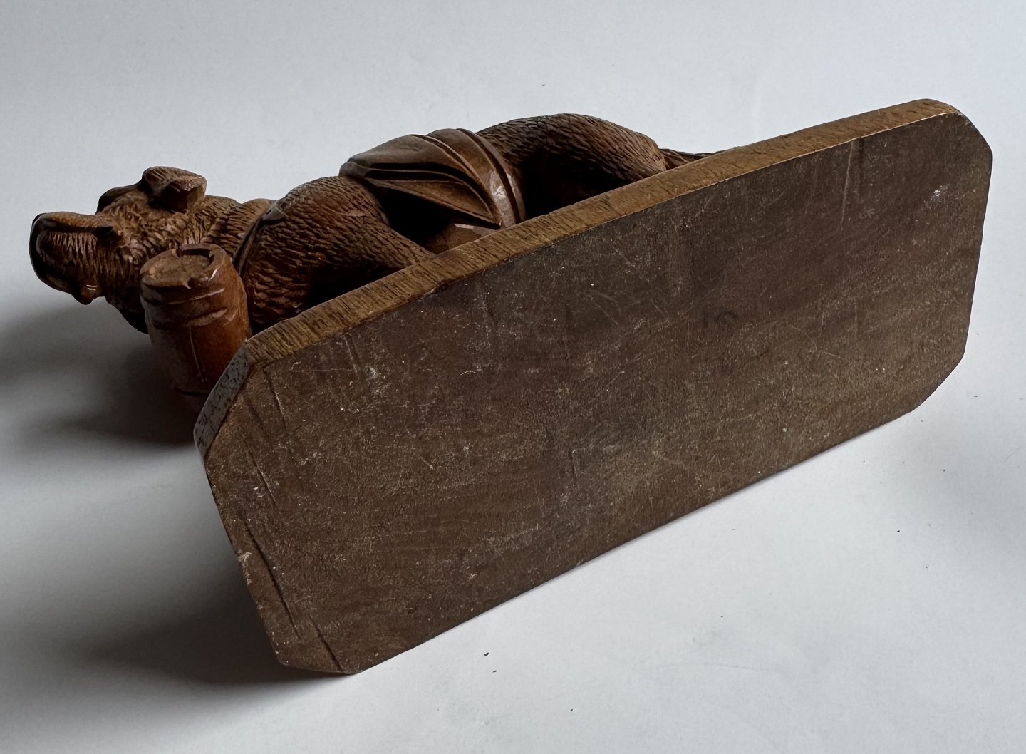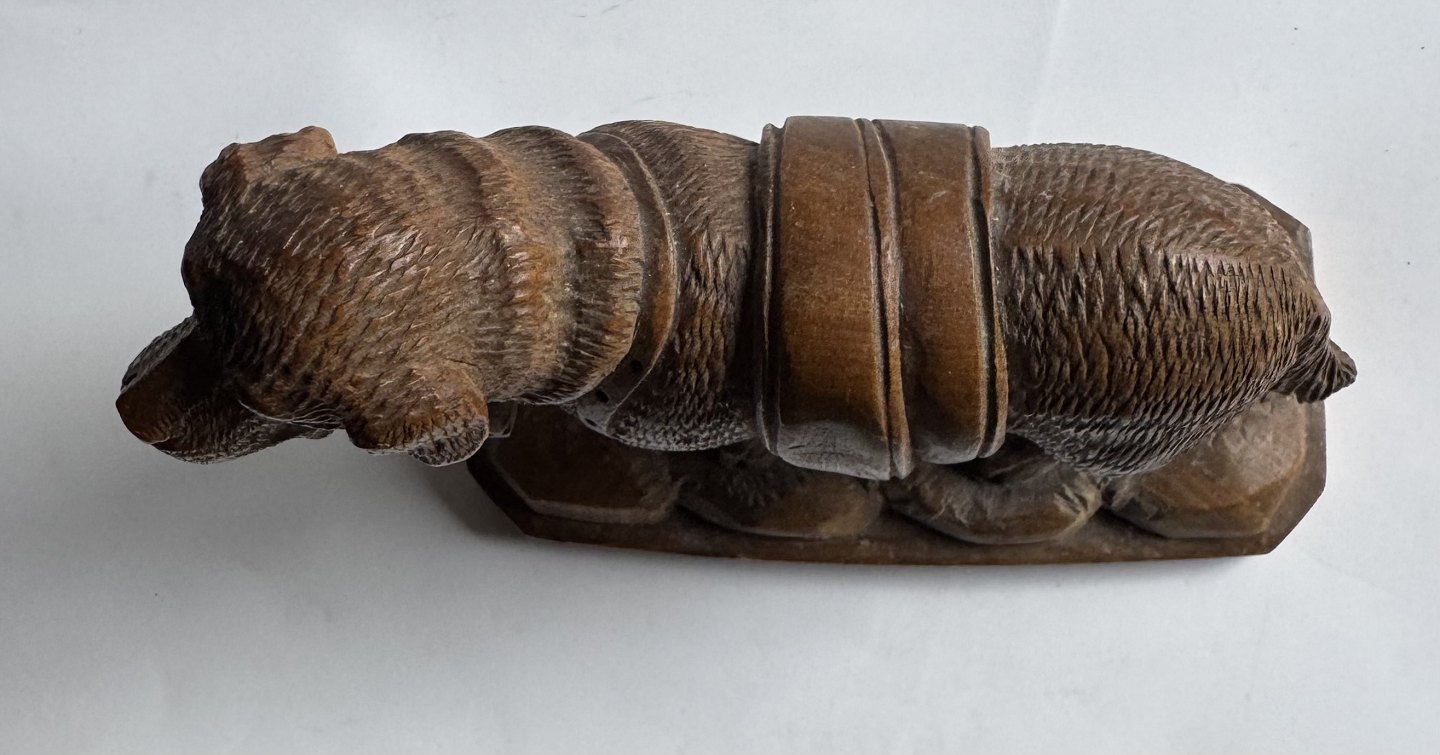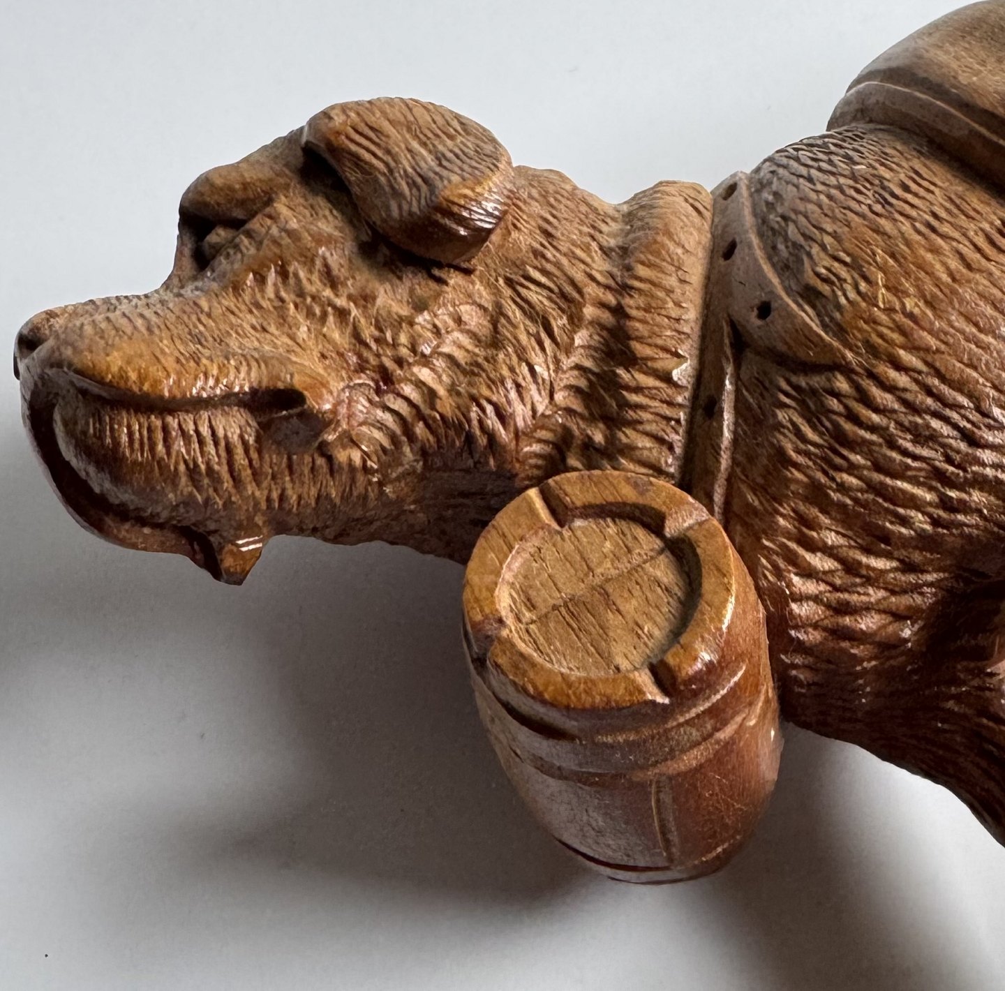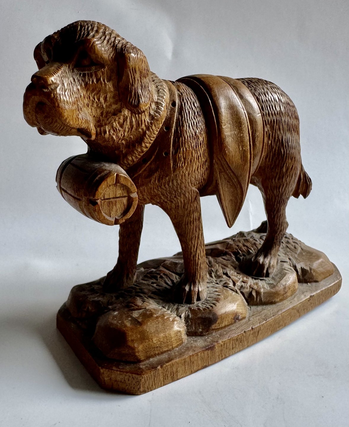 Carved figure in linden wood depicting a Saint Bernard dog with the eternal wooden barrel around its neck. Made in Switzerland in the early 20th century. Appears in good condition without damage or repairs. Dimensions: H. 12.5 cm. The base measures 6.2 x 13.4 cm.