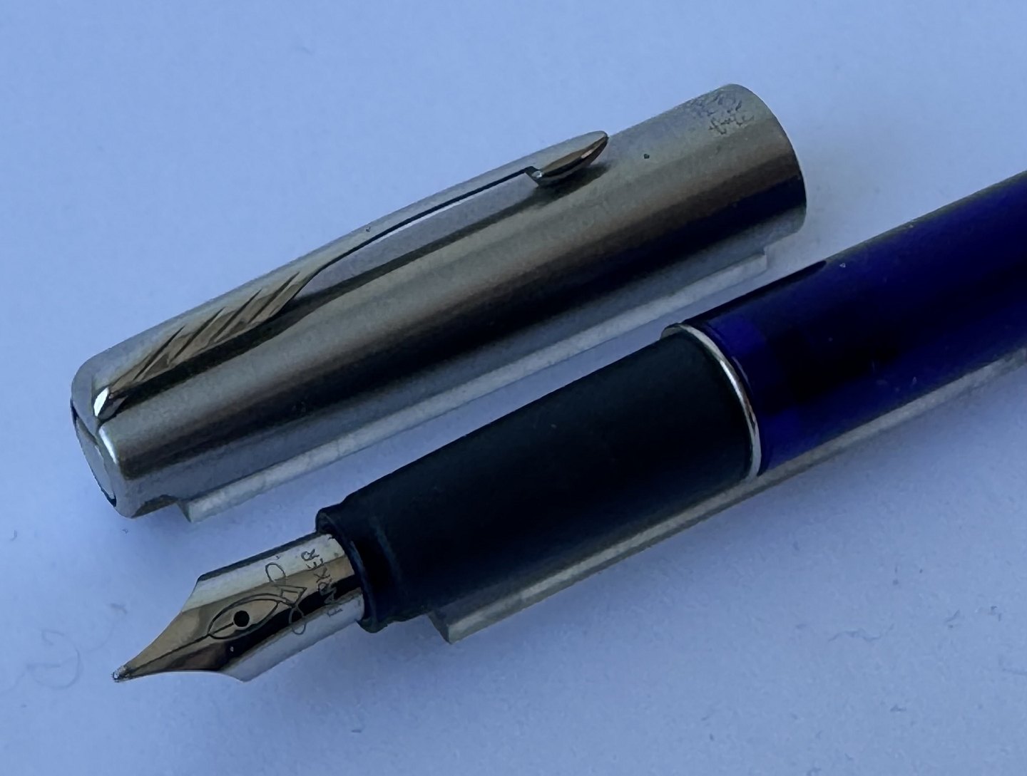 Blue Parker Frontier fountain pen with steel cap. Manufactured from the mid-1990s. Ready to be used when a new ink cartridge is inserted. L. 13.3 cm