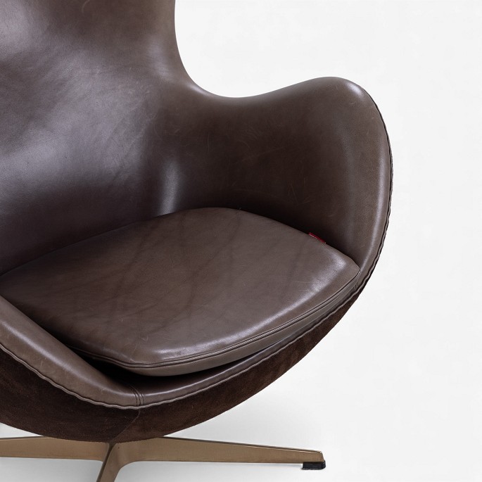 AJ 3316 - 'The Egg' armchair with stool in original dark brown Elegance leather and brown suede on a bronze frame. Anniversary model from 2008. Number 489/999.