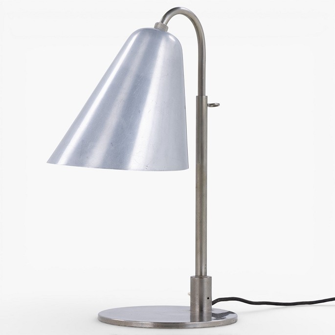 Rare table lamp in nickel-plated metal with funnel-shaped shade. Made in the 1930s.