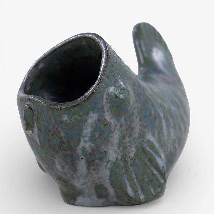 Small stoneware fish with blue-green glaze. Signed.