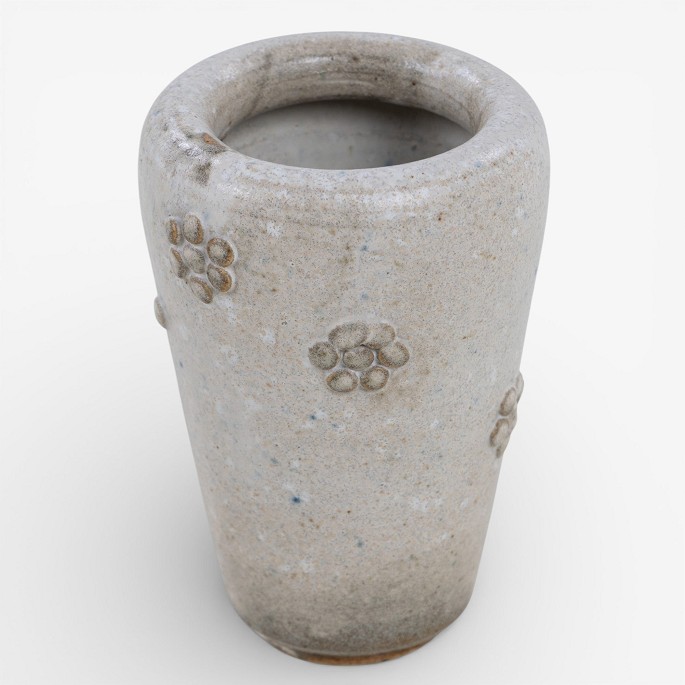 Stoneware vase decorated with white glaze and floral motif. Signed.