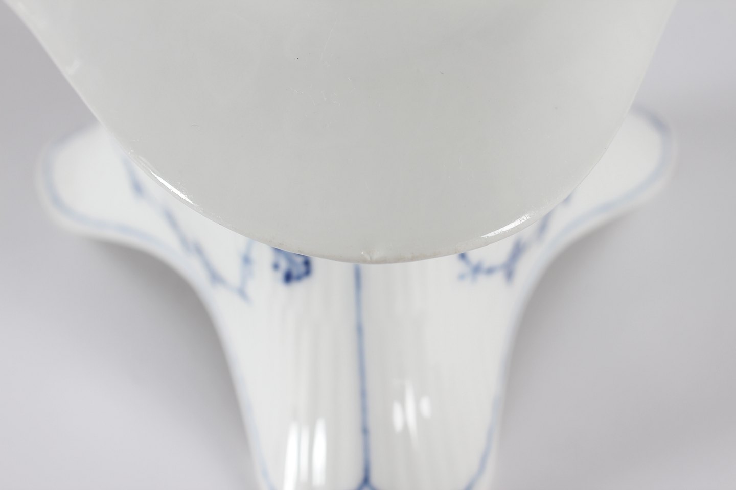 Royal Copenhagen blue fluted plain Triangular sauce boat no. 1/203 With stamp from the period 1894-1922 Length 21 cm Width 21 cm Height 12 cm Factory 1 - see images of three small chips