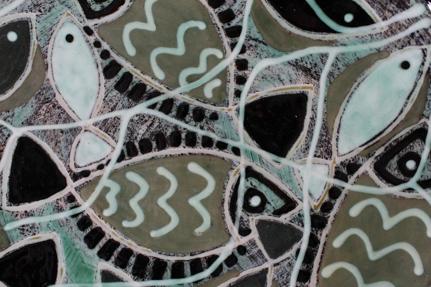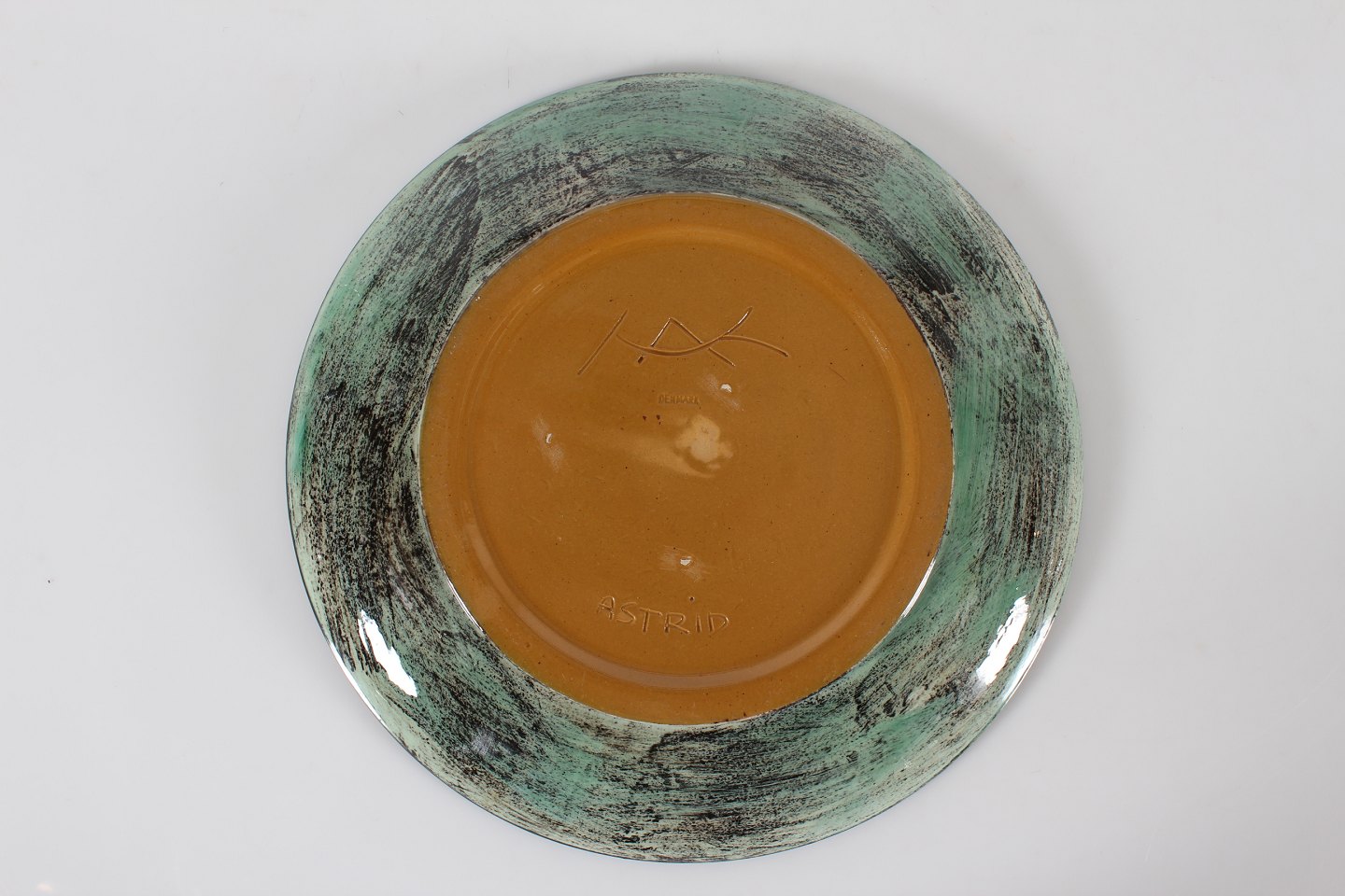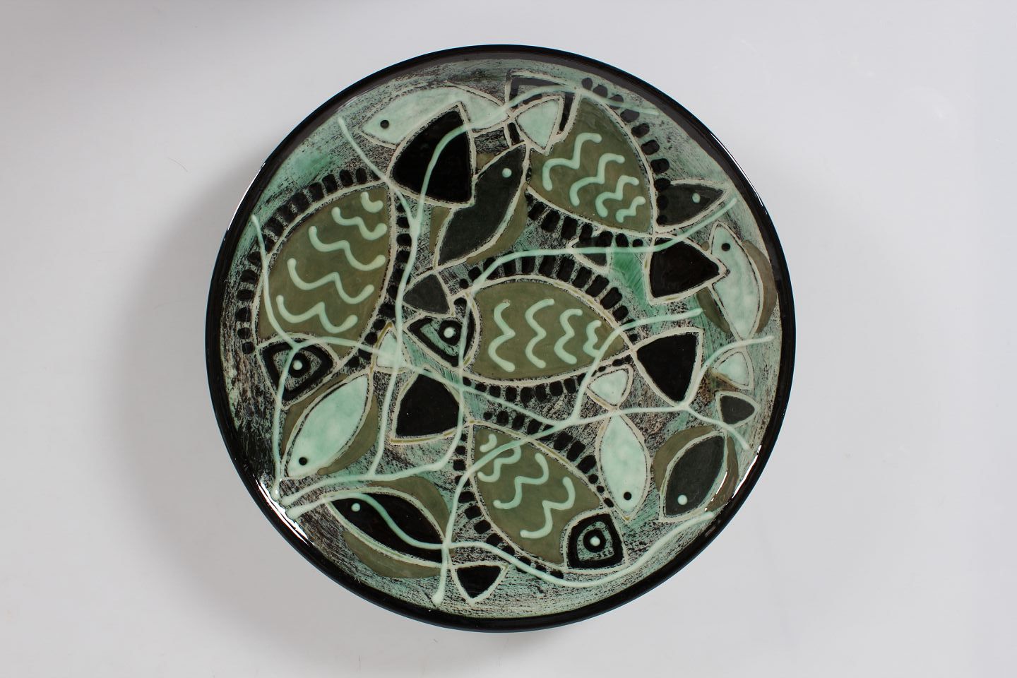 Herman A. Kähler Large ceramic platter with fish decoration by Astrid Tjalk Sign. HAK + Astrid Diameter 31 cm Height 3.5 cm Very good condition without chips, cracks or repair