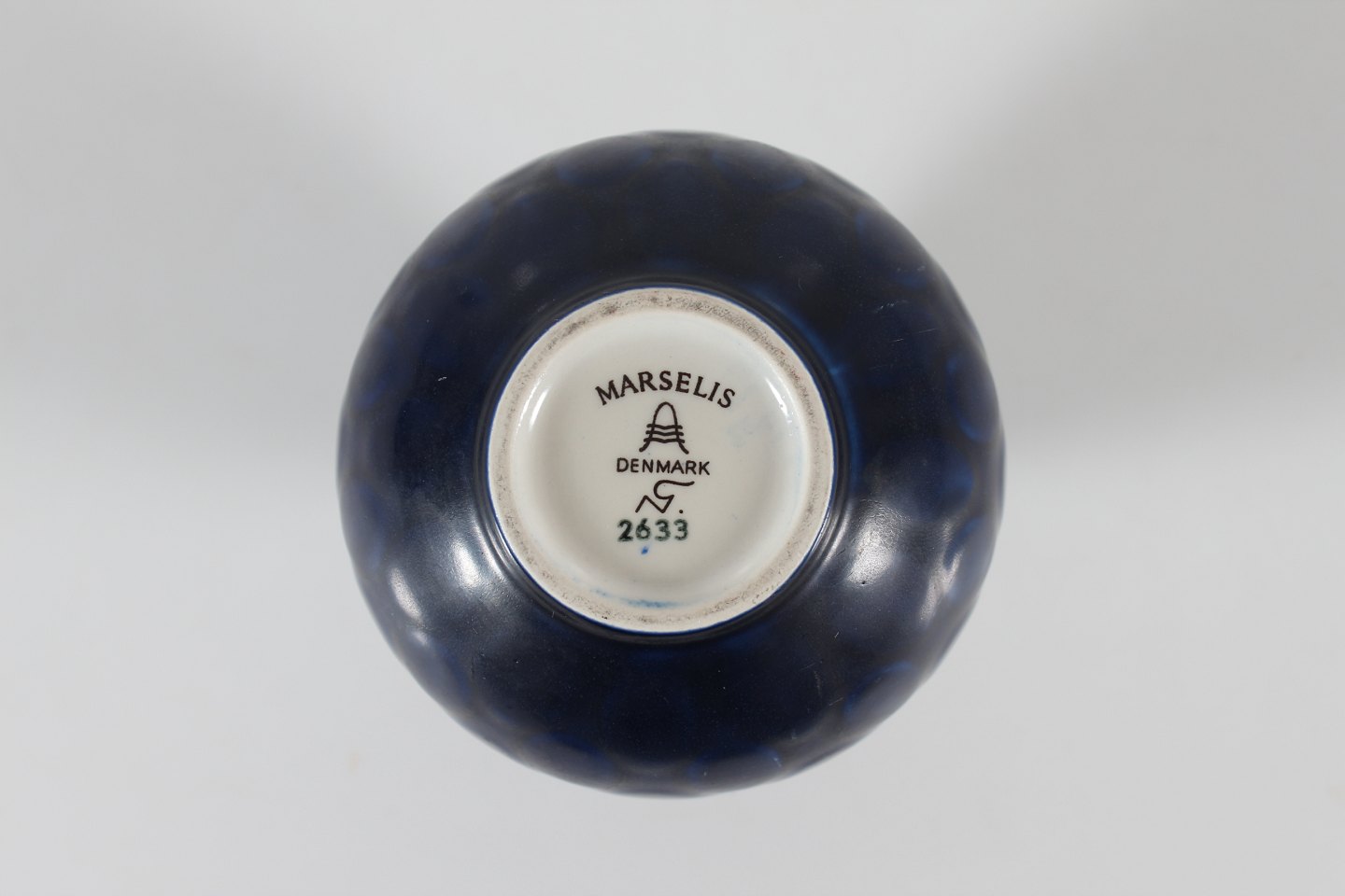 Royal Copenhagen + Nils Thorsson (1898-1975) Drop-shaped vase no. 2633 with geometric pattern decorated with blue glaze sign with logo for Nils Thorsson Height 13,5 cm Diameter 10 cm Very nice condition - no chips or repair
