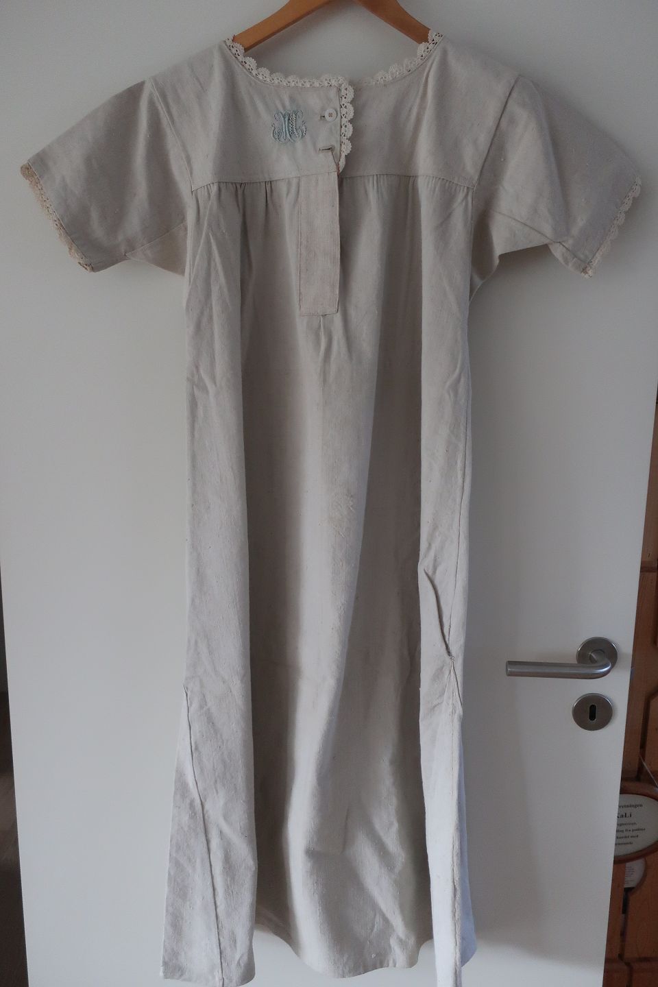 Særken er med håndbroderet knaphuller, håndbroderede initialer, håndhæklede kanter samt anden pynt.