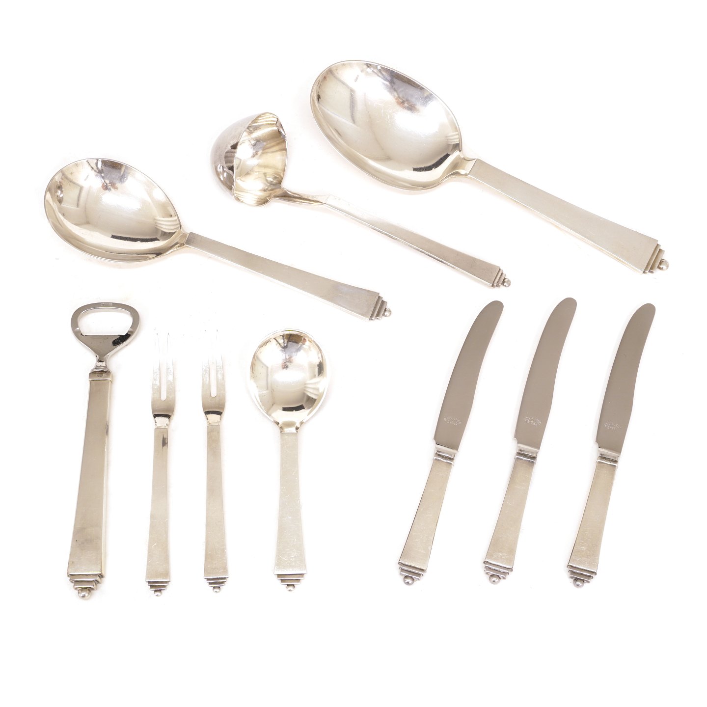 Georg Jensen pyramidebestik i sølv komplet til i alt 12 personer. Fra perioden 1933-44. Tegnet af Harald Nielsen 1927 for Georg Jensen. I alt 106 dele