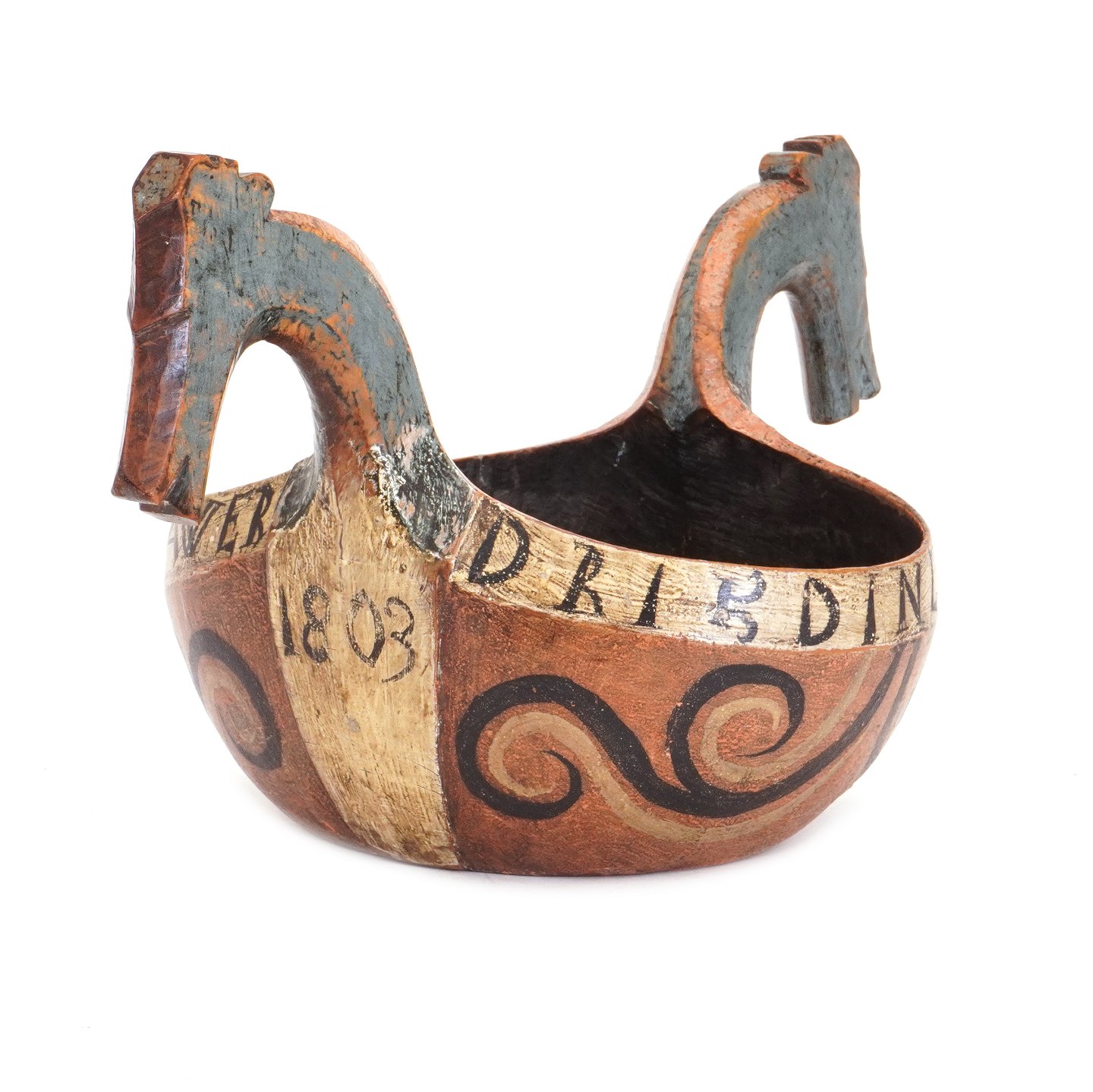 Norwegian early 19th century wood cut drinking bowl dated 1803. H: 21cm. L: 41cm