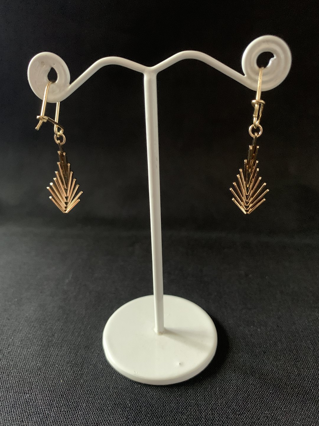 These gold earrings have a beautiful herring bone pattern and dynamic curved shape. The earrings hang in a ring, which means that the earrings move alive when they are worn. If you want nice earrings for everyday use, these earrings will be a good choice.
