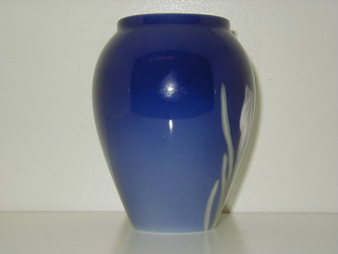 Mørkeblå Kongelig Vase med Hvide Blomster, dek. nr. 590/271, medarbejder sortering, måler 11,5 cm. Perfekt stand.