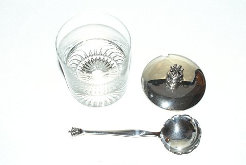 Danish crown Jam Jar, Sterling Silver Spoon length 15 cm. Diameter 8 cm. Height 12 cm. Beautiful and well maintained.