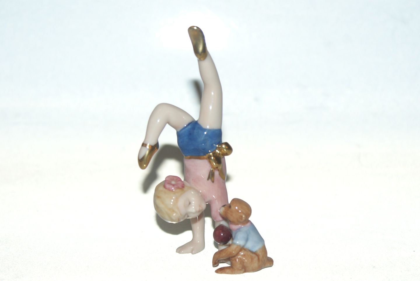 Royal Copenhagen mini collection girl stands on hands with monkey Deck No. 201 Height 11 cm Nice and well maintained condition https://www.antik-huset.dk/royal-copenhagen-mini-collection-pige-star-pa-haender-med-abe.html
