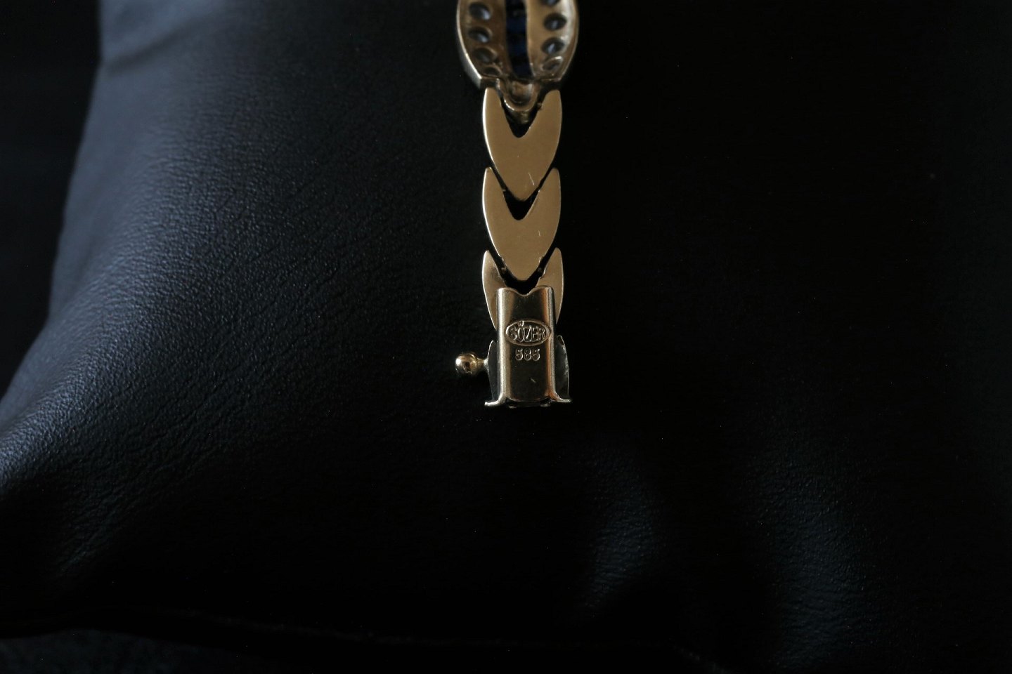 Beautiful and elegant gold bracelet in 14 carat gold, with embedded swarovski stones and blue sapphires. Incredibly elegant and beautiful bracelet that can be worn with a beautiful dress.