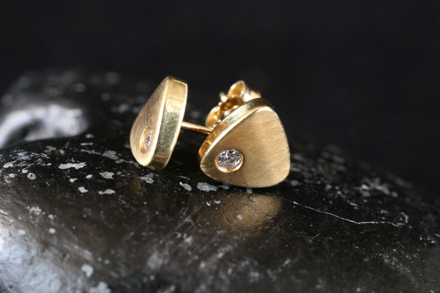 Beautiful studs in 14 carat gold, with inlaid clear stone. The ear studs are exclusive when they appear in gold. The elegant triangular shape with rounded edges is beautiful and elegant. Since these ear studs are not that big, they can be combined with other earrings or studs.