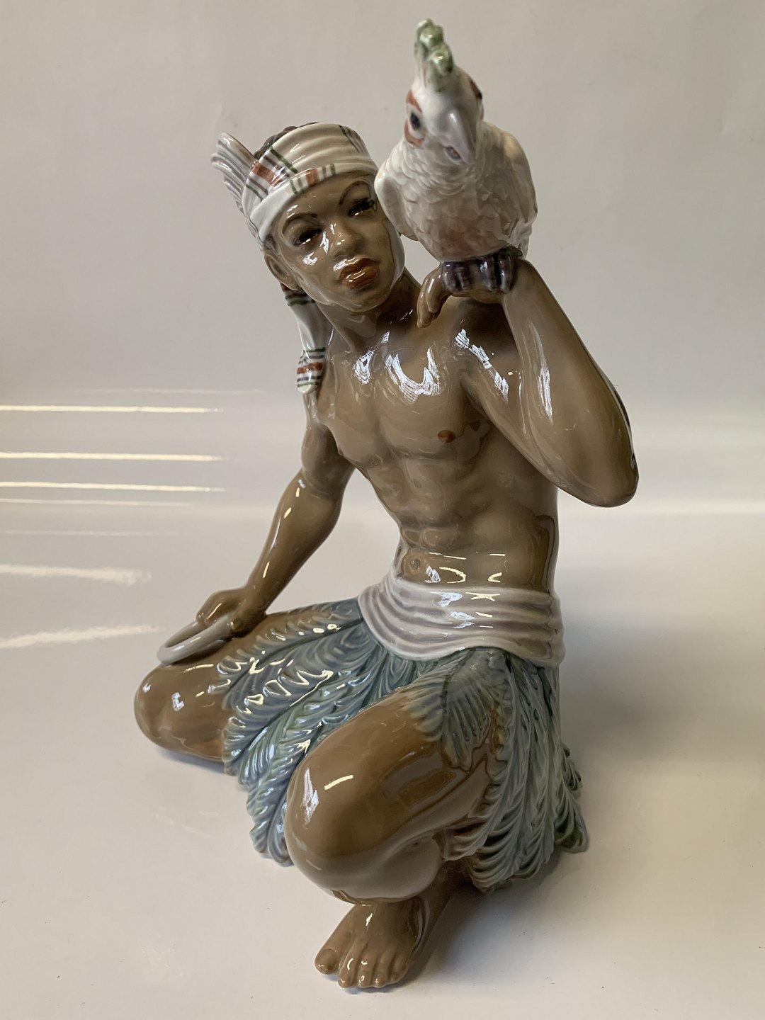 Dahl Jensen orientalsk figur, sudaner med kakadue. Dekorationsnummer: 1305. 2. sortering. Måler: 16,5 x 16,5 cm., højde: 24,5 cm. Perfekt stand uden fejl.