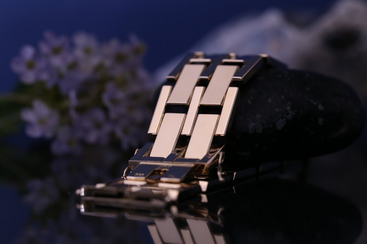 Block gold bracelet with 5 rows and lobster clasp. Stamped HV & SK 585