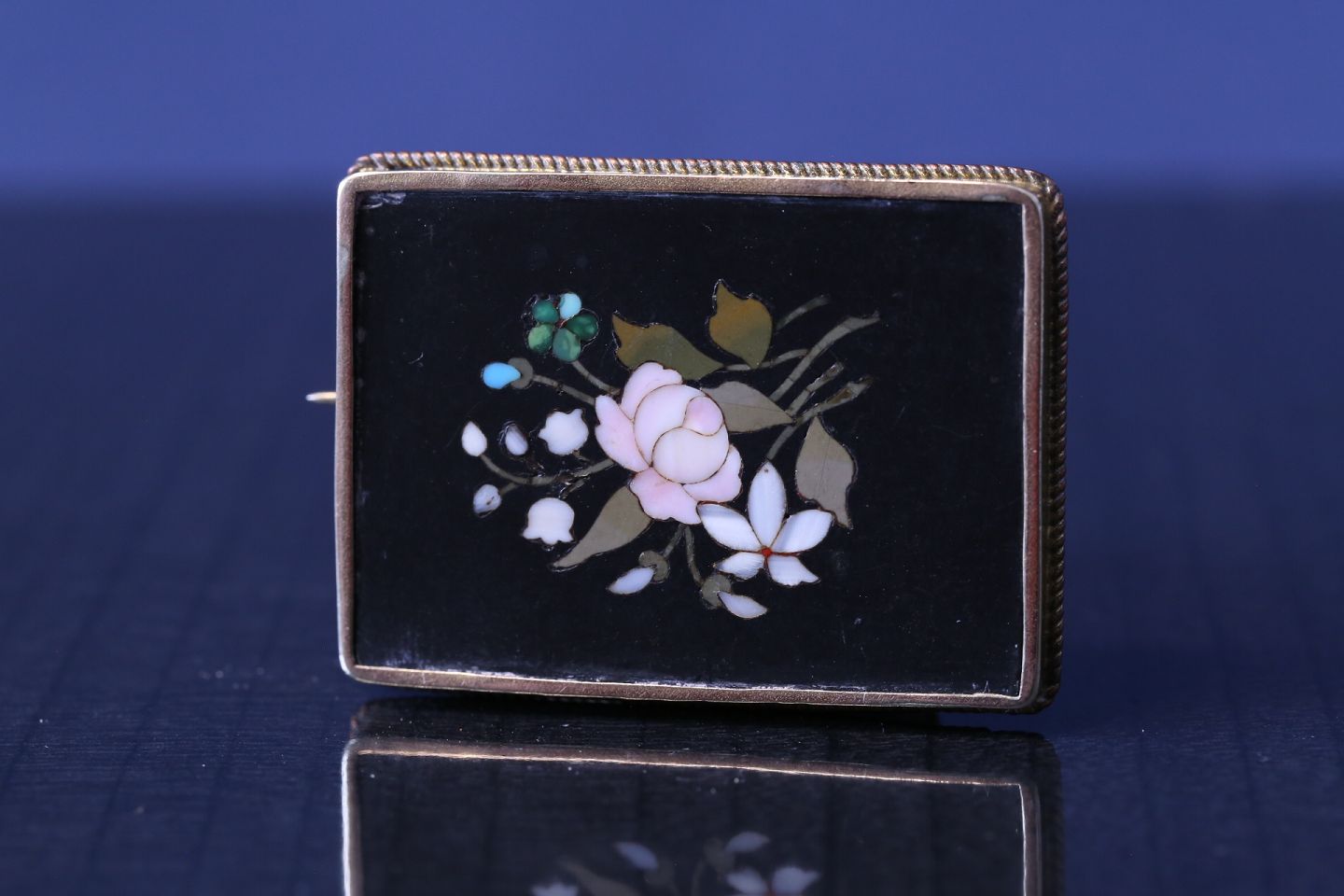 This brooch is a very special antique. It is made as a mosaic with different colors, which creates a beautiful floral pattern. The many details and colors bring the brooch to life. At the same time, the black background highlights the pattern, so that it appears clear and beautiful.