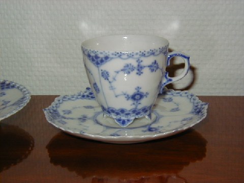 Royal Copenhagen Blue Fluted Full Lace Cups on feet and full lace sideplates. The cups and saucers have number 1/1037 and the sideplates have number 1/1088. We have six set and the price is for each set. (1 cup, 1 saucer and 1 sideplate).