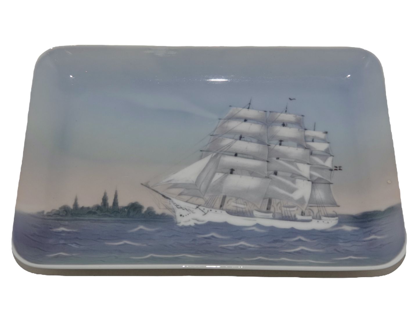 Large Bing & Grondahl square dish decorated with the School ship called Danmark.