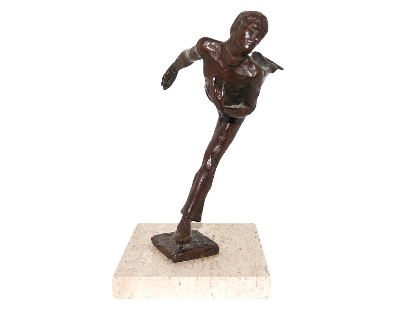 Royal Copenhagen bronzefigur af skøjteløber på marmorsokkel. Designet af Designet af Sterett-Gittings Kelsey. Med messingplakette nummereret 203/2500. Længde 20,0 cm., højde 22,5 cm. Fejlfri stand med fin patina.