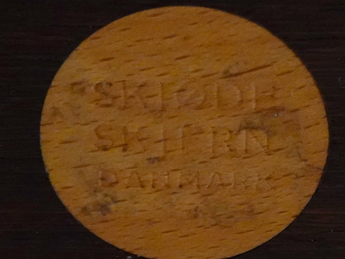 Skjøde Skern, stort rundt ostefad i wengetræ med indlagt bøgetræ. Designet af Theodor Skjøde Knudsen. Diameter 36,5 cm. En metaldut mangler i bunden ellers perfekt stand.