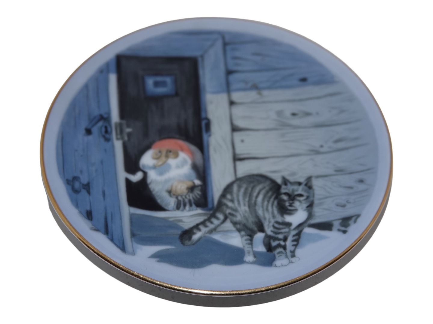 Round lidded box with Christmas gnomes