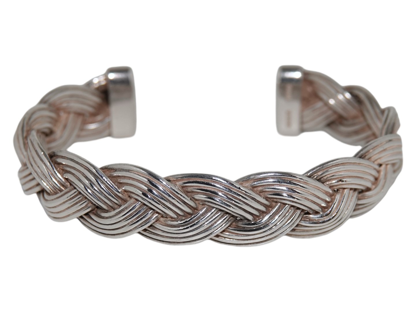 Ole Lynggaard sterlingsølv, flettet armbånd i flot og kraftig kvalitet. Stemplet "OleL 925S". Indvendig diameter 7,5 cm., bredde 1,5 cm. Fin og velholdt stand.