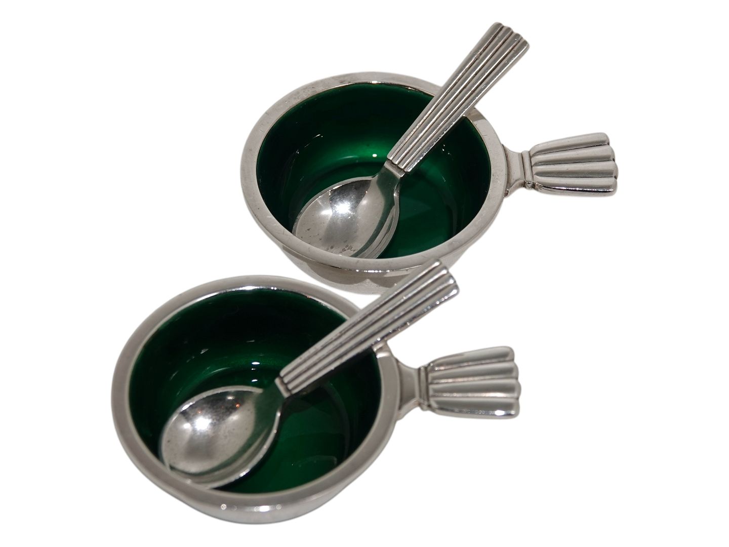 Georg Jensen Bernadotte Sterlingsølv, saltkar med grøn emalje og tilhørende saltske. Dessinnummer 9. Længde 6,1 cm., diameter 4,5 cm., saltskeen måler 5,1 cm. Perfekt stand uden indgraveringer.