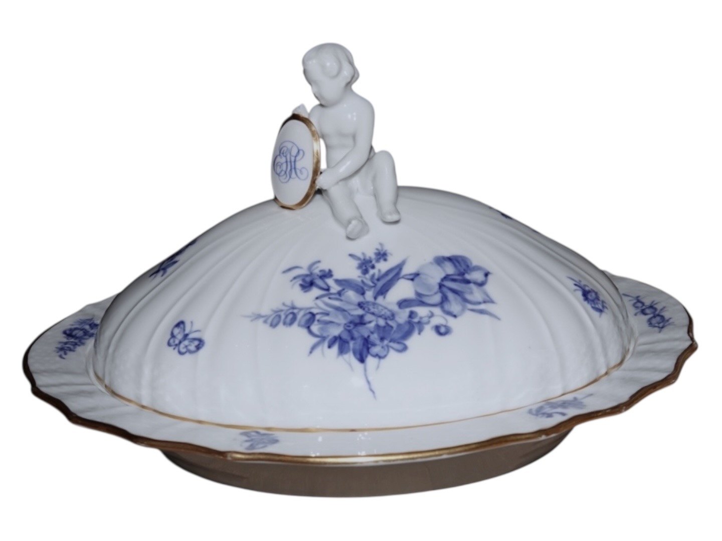 Royal Copenhagen Blue Flower Curved with gold edge, large and rare lidded bowl with a boy figurine on top. There is a monogram on the plaque beside the boy.