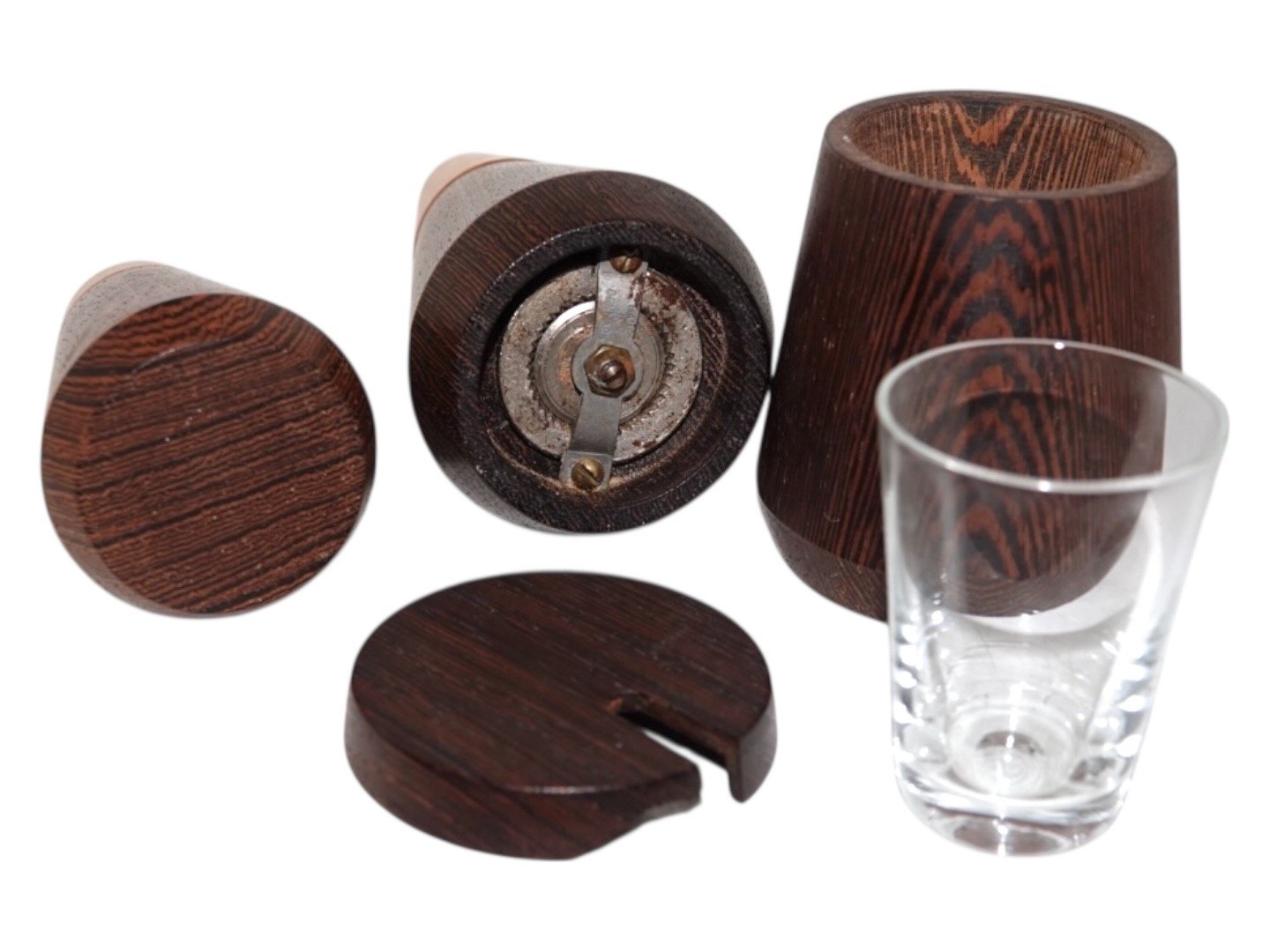 Dansk design, Plat de menage med udført i wenge træ, ahorn samt messing. Der er peberkværn, saltbøsse og sennepskrukke med glasindsats.