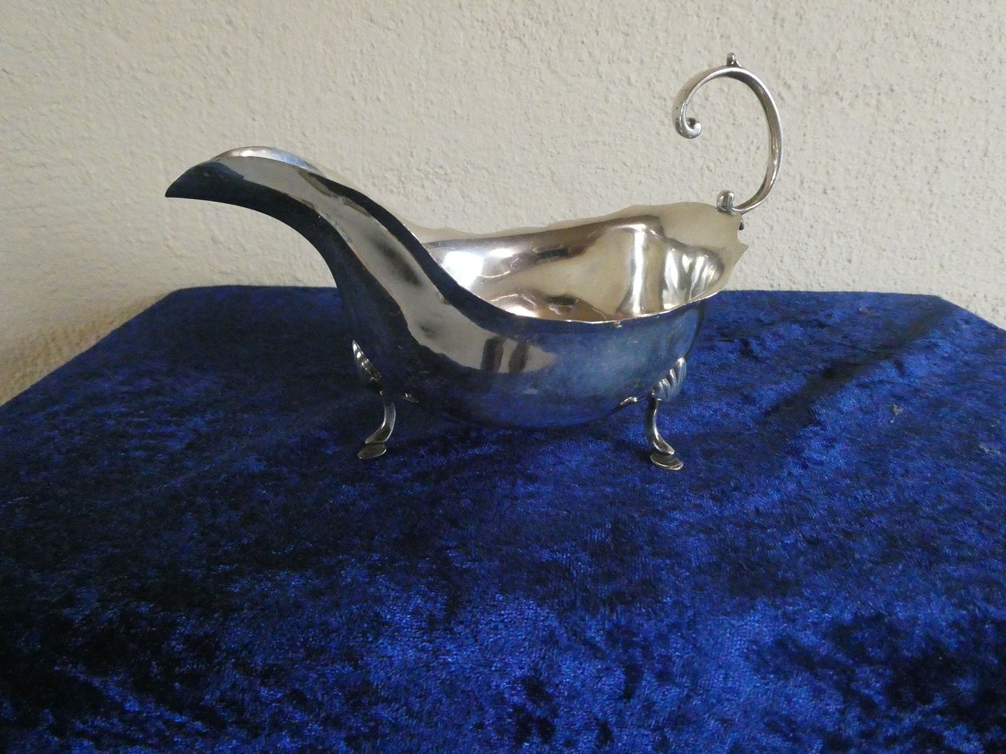 Sauce boat or gravy boat on three feet of English tableware sterling silver 925S, hallmarked in Birmingham 1941-1942 by Charles S Green & Co.