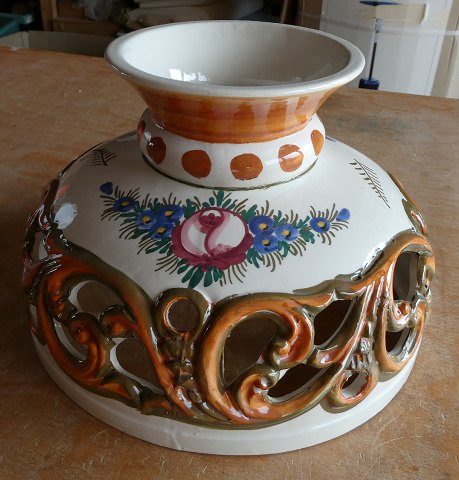 Flot dekoreret skærm i stentøj samt glasrør til petroleumslampen.