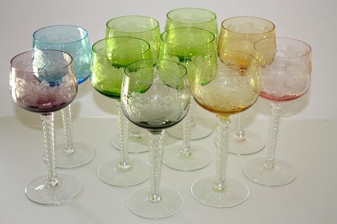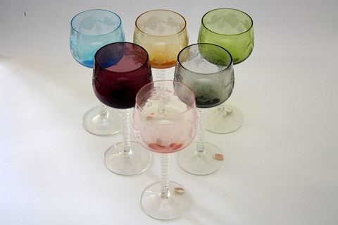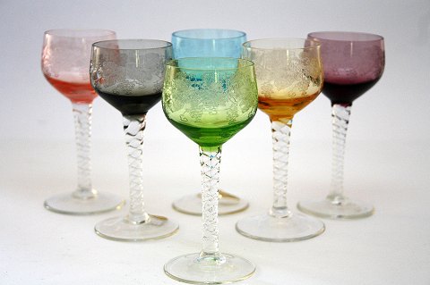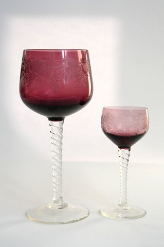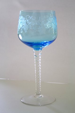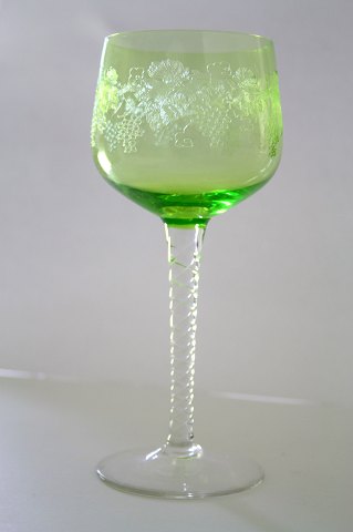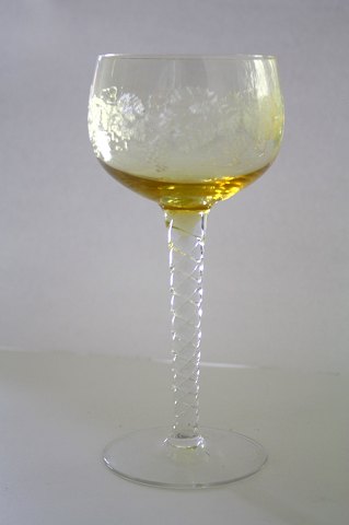 Bøhmisk, Bohemia Glass med snoet stilk og drueslibninger på kumme. Kaldes også Rømerglas. Højde 17,2 cm. Produceret i Tjekkiet. Pris: 150 kr. stk.Ravgul: Lager: 2