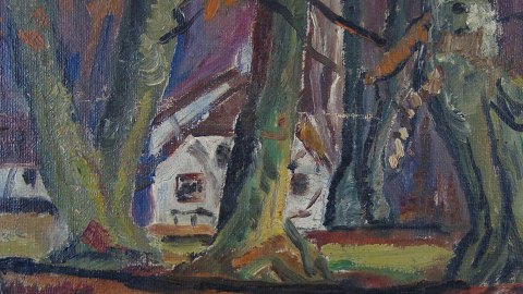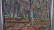 Maleri - Efterårsskov med hus.