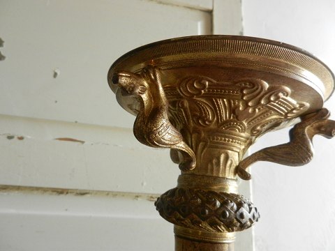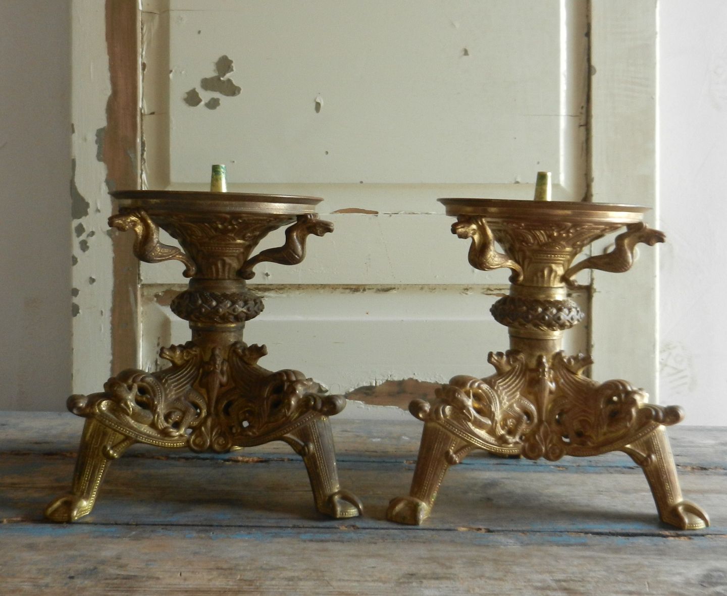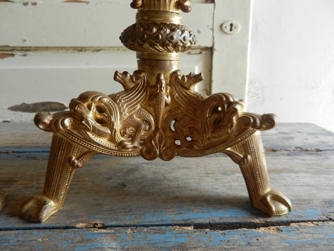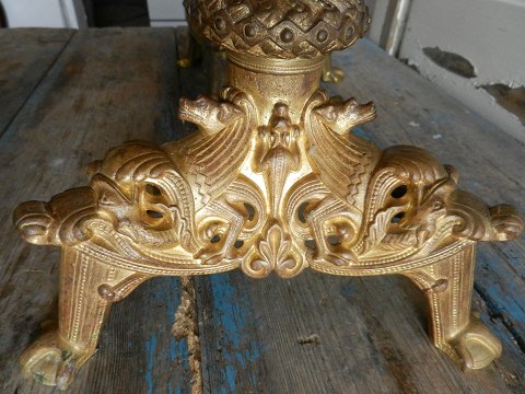 Par meget smukke lue forgyldte bronze stager. Stagerne er dekoreret i ny gotisk stil, med salamandere og ulve hoveder.Højde 24cm. Diameter top/bund 17/23cm.