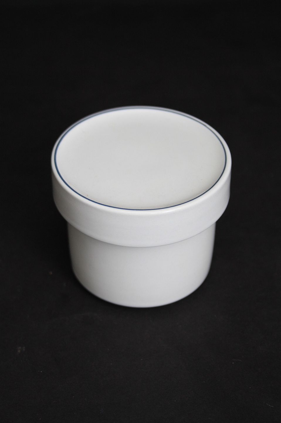 Royal Copenhagen fajance, Blåkant tidligere produceret under Aluminia. Designet af Grethe Meyer i 1965Lille sukkerskål med låg. Nr. 3053. Højde 6 cm. Diameter med låg 7 cm. I. sortering. Pris: 125 kr.