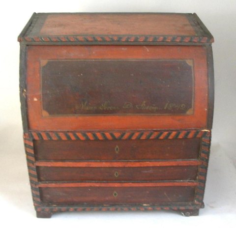 Danish doll bureau painted in earth colors. The front closed, rear open with two doors under which there are a few smaller pull-out drawers. At the front a signature: Maren Sørens D (daughter) Smerup 1842. Edges with cuts. Beautiful condition - with wear and tear. H: 42 cm. B: 41 cm. D: 30 cm.Item number: 1232