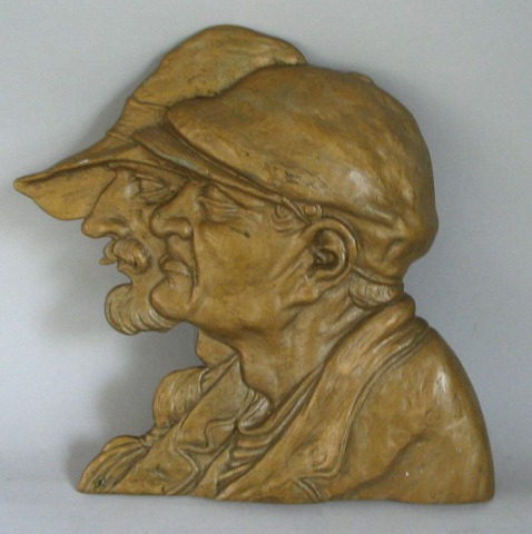 Danish artist (19th/20th century): Two people in protile. Metal - probably aluminum. Bronzed. . H.: 33 cm. W.: 30.5 cm. Made by the artist Elg. P., Nästved. The original in bronze, signed: ELG P 1925.Item number: 1334