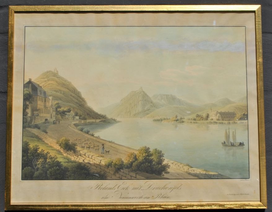 Hand colored topographic aquatint of Carl Wizani (1767 - 1818), Germany. Roland Eck and Drackenfels und Nunnenwerth, River Rhein. With the press frame. Signed. Published by Art Verlag L. v. Kleist in Dresden. 35 x 50 cm. In modern gold frame.Item number: 3895